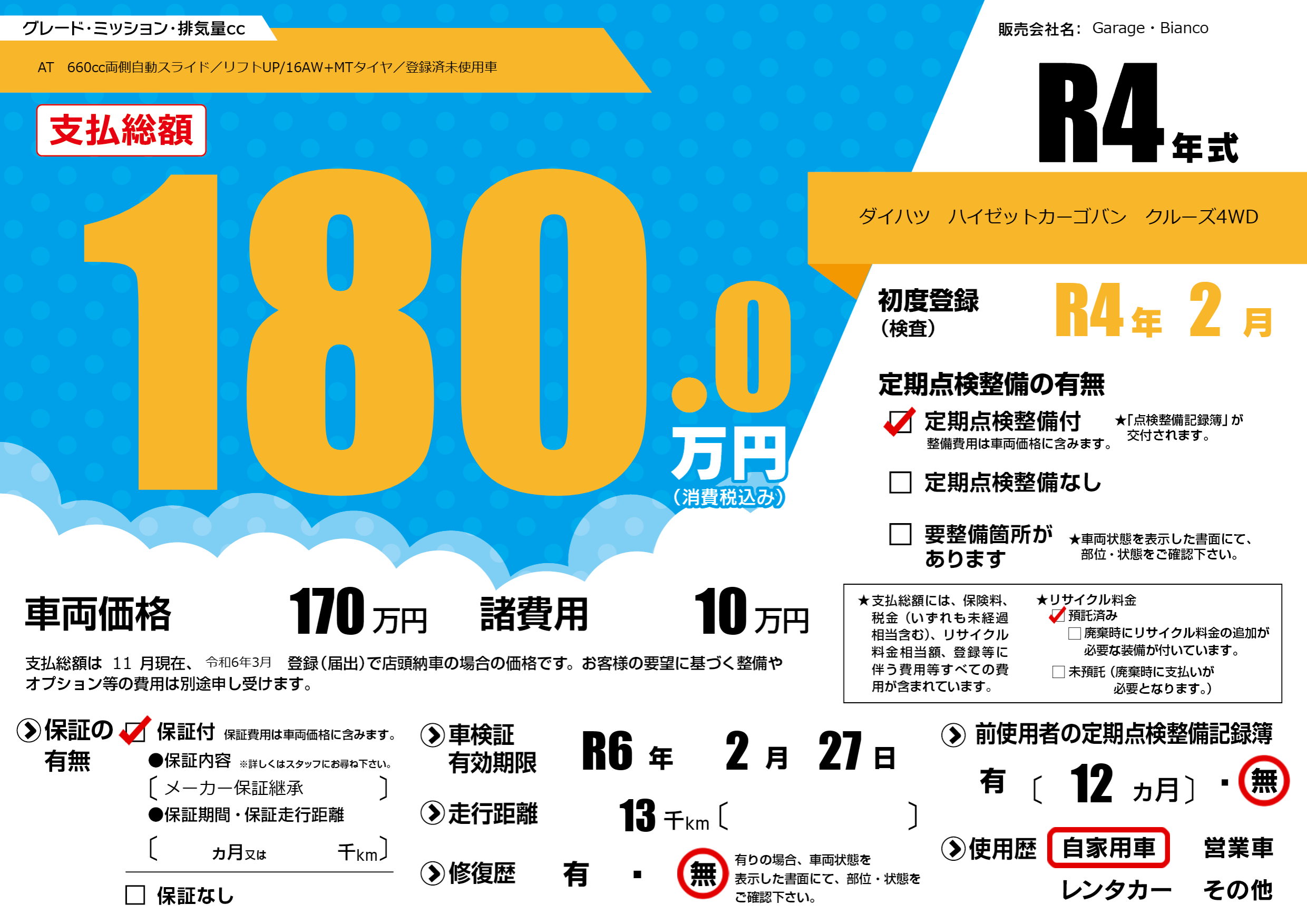 | 車名 | ダイハツ ハイゼットカーゴバン クルーズ4WD | グレード ミッション 排気量 |