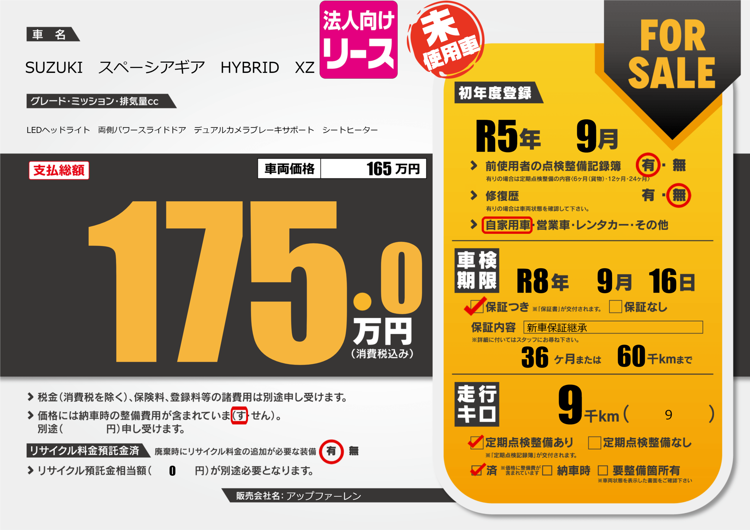 | 走行キロ | 0.9万km | 初年度登録 | R5年9月 |