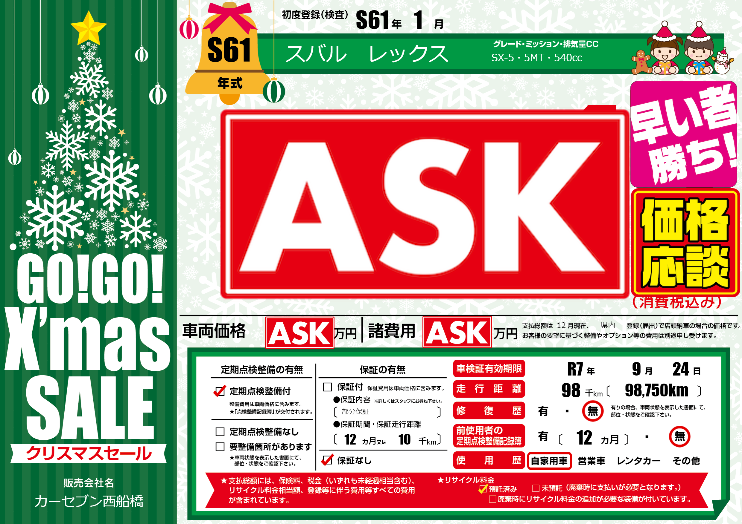 | 走行キロ | 9.8万km | 初年度登録 | S61年1月 |