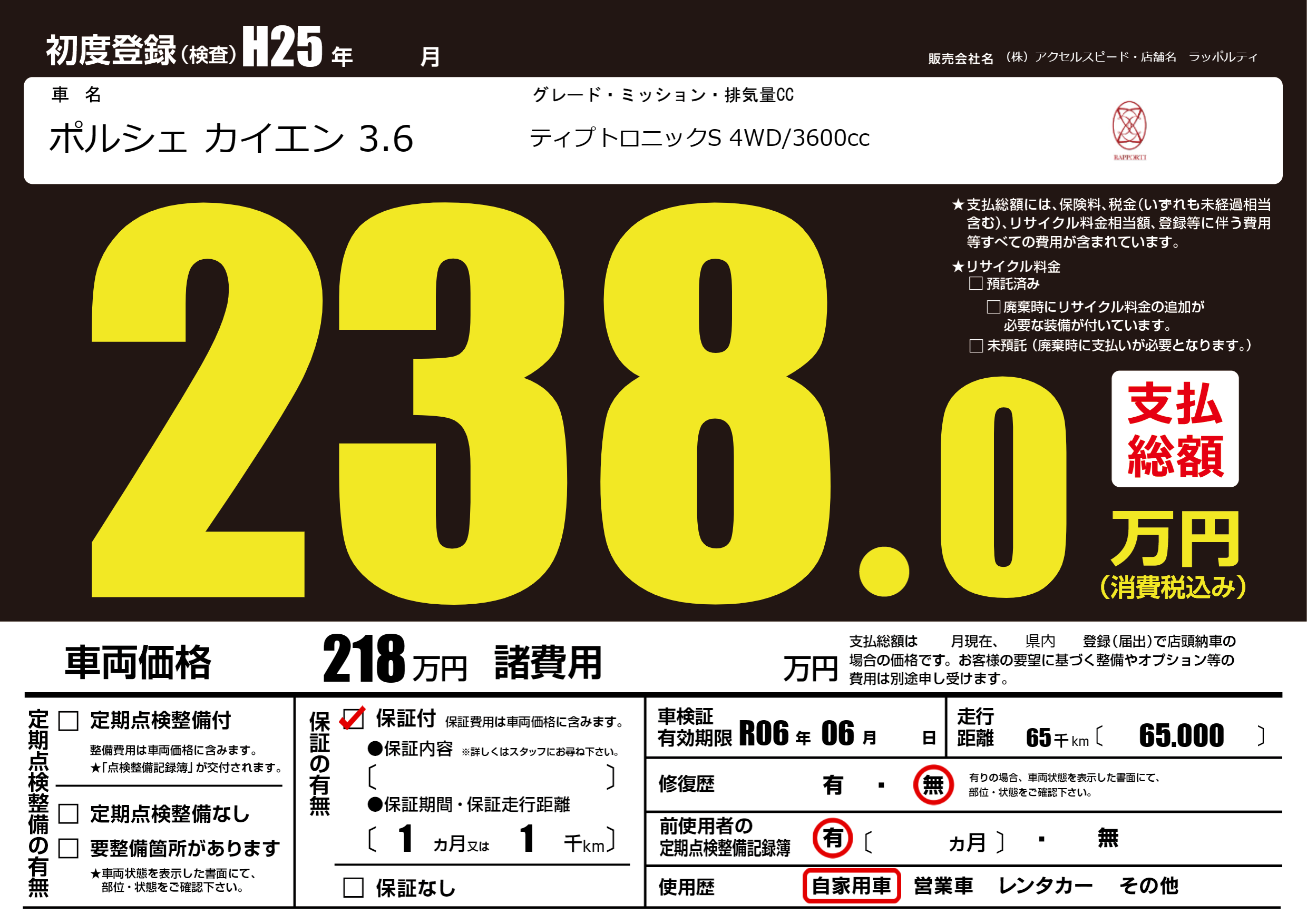 | 車名 | ポルシェ カイエン 3.6 | グレード ミッション 排気量 |