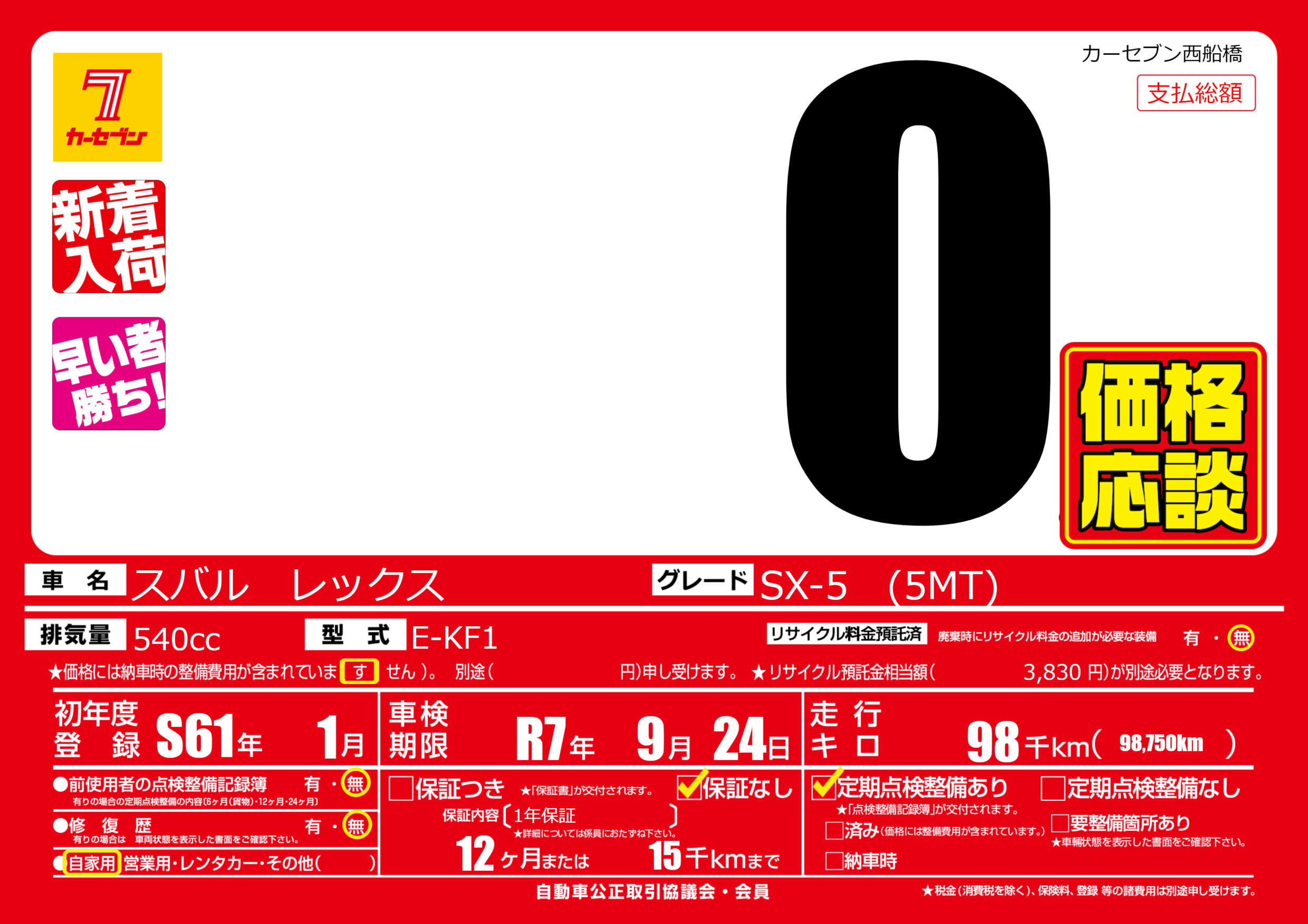 | 車検制限 | R7年 9月 24日 | ||