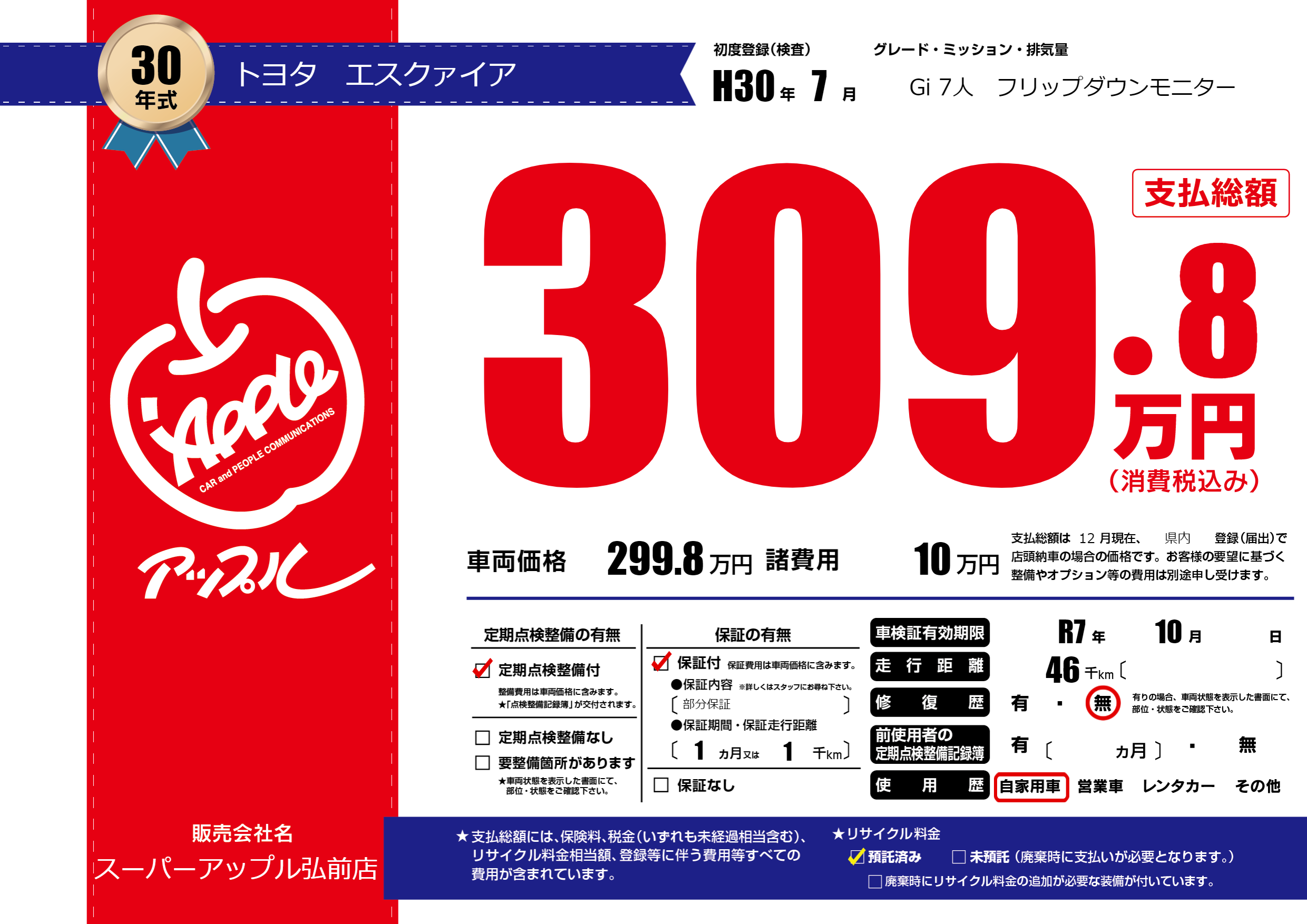 | 車名 | トヨタ エスクァイア | グレード ミッション 排気量 |