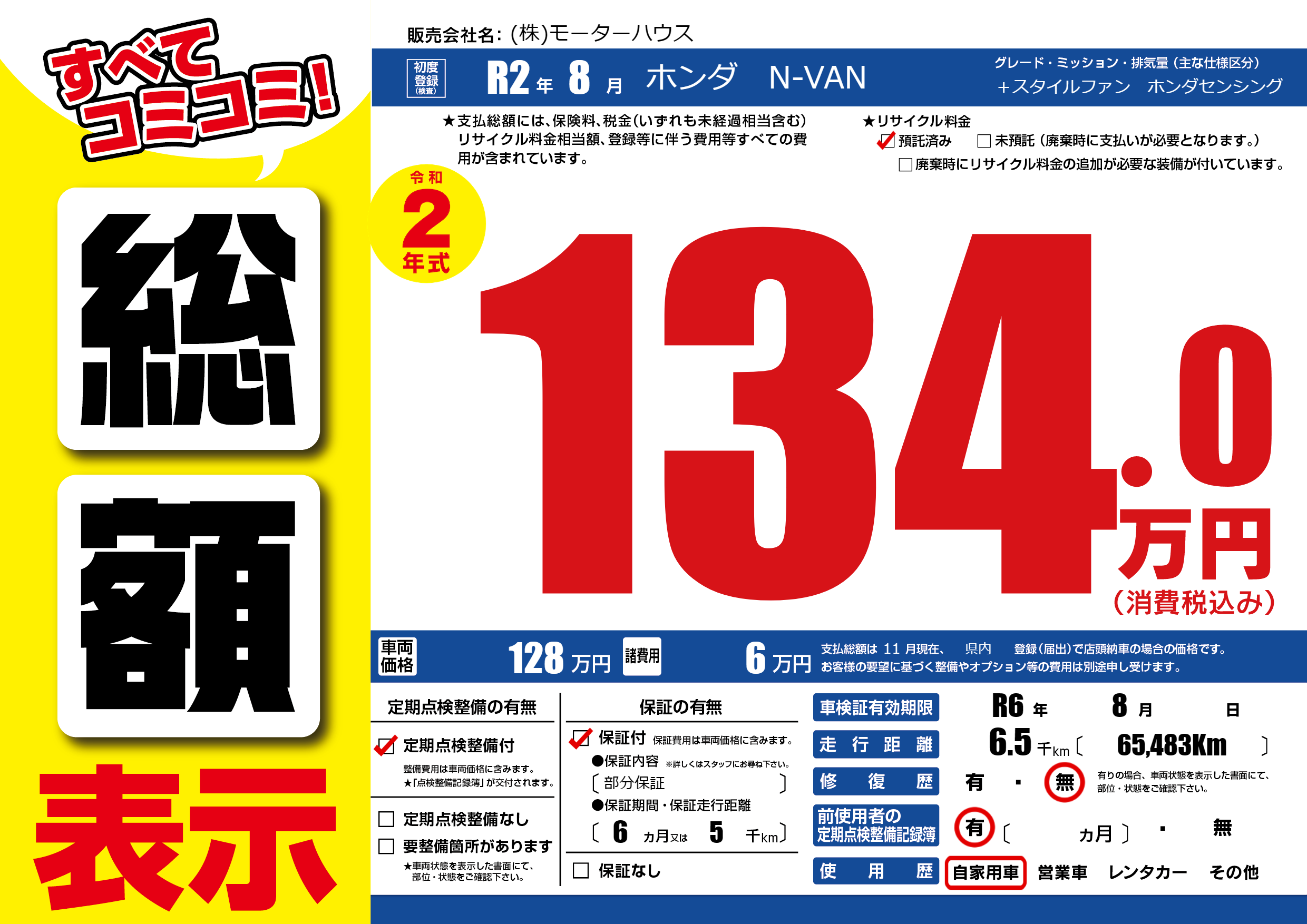 | 車名 | ホンダ N-VAN | グレード ミッション 排気量 |
