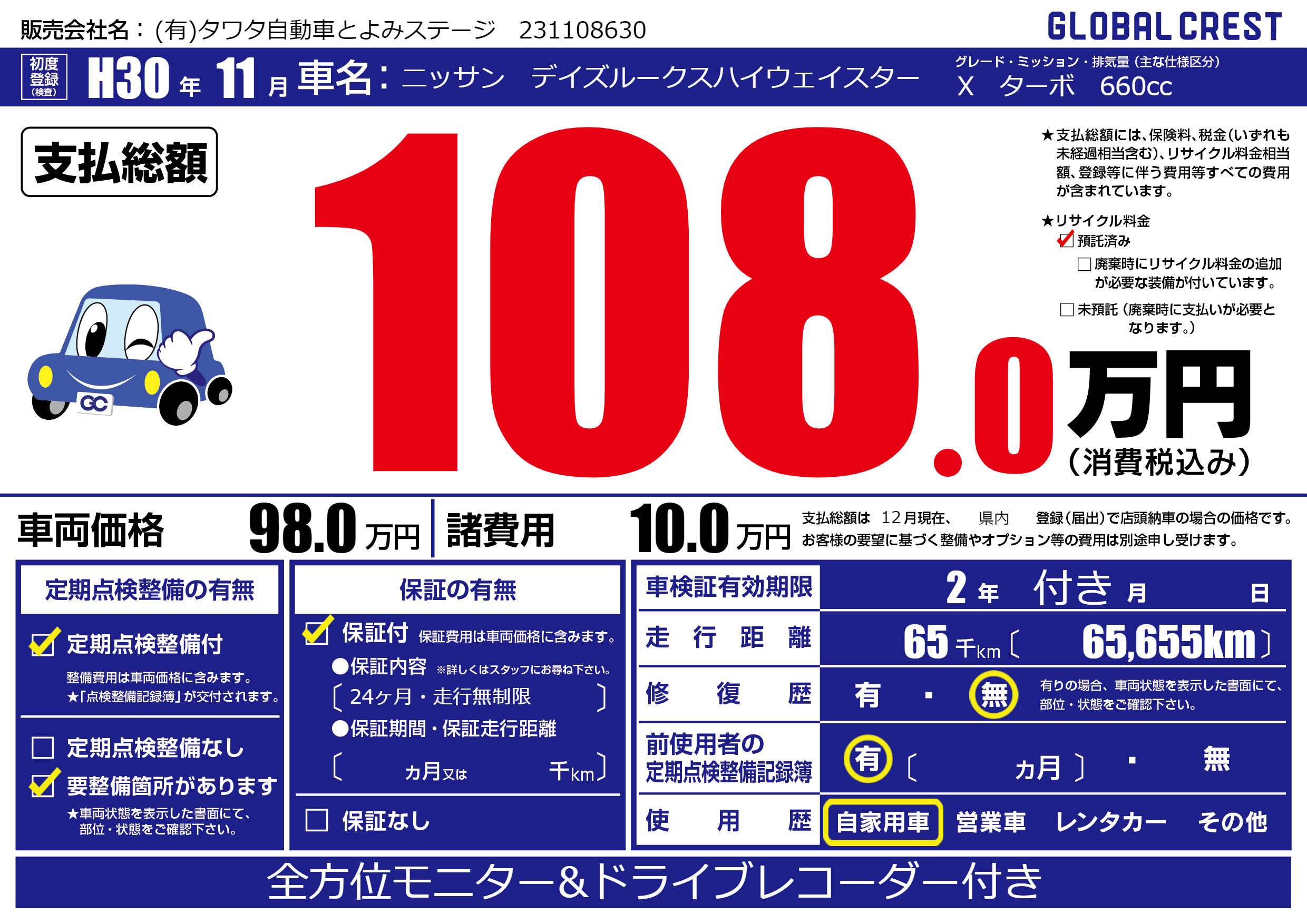 | 走行キロ | 6.5万km | 初年度登録 | H30年11月 |