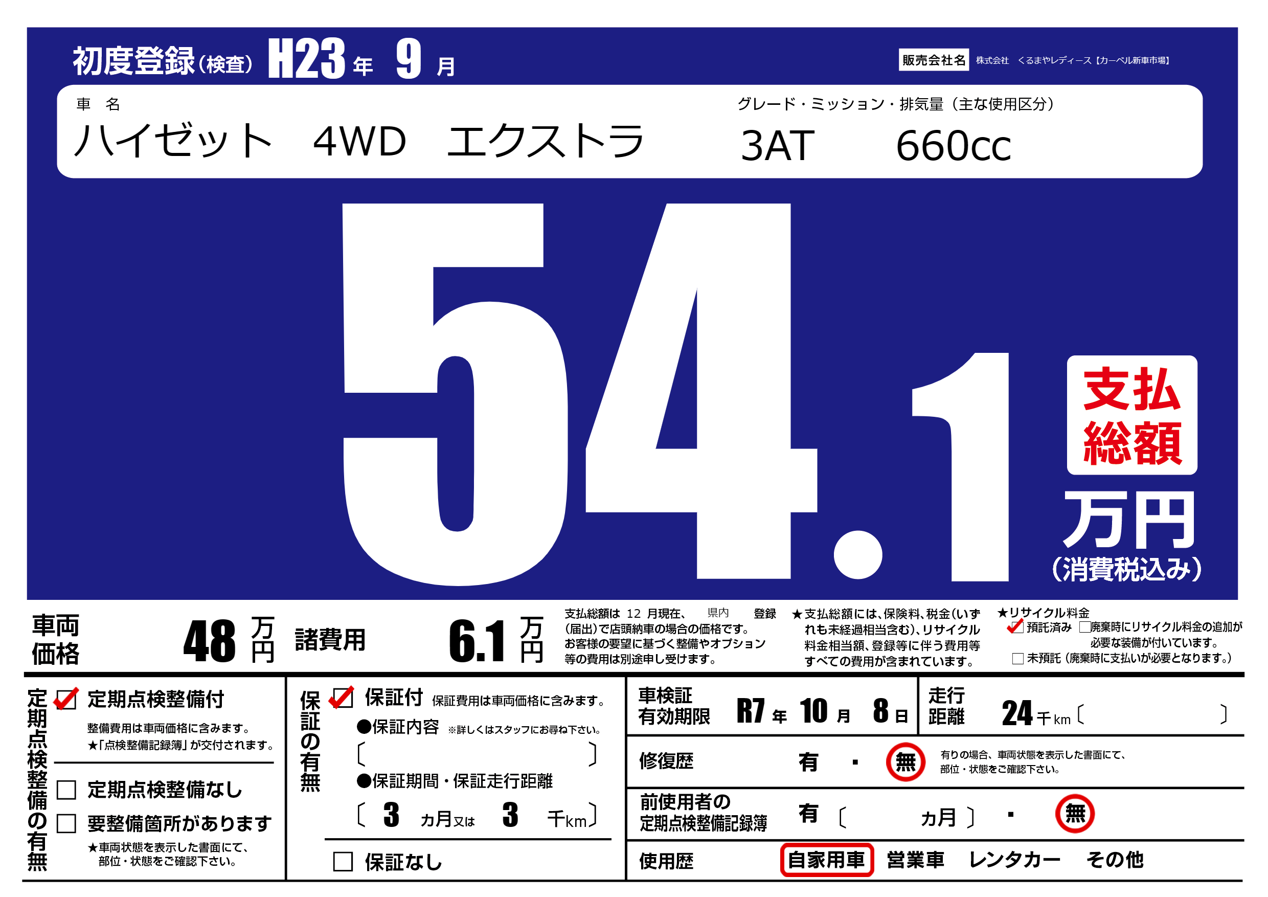 | 走行キロ | 2.4万km | 初年度登録 | H23年9月 |