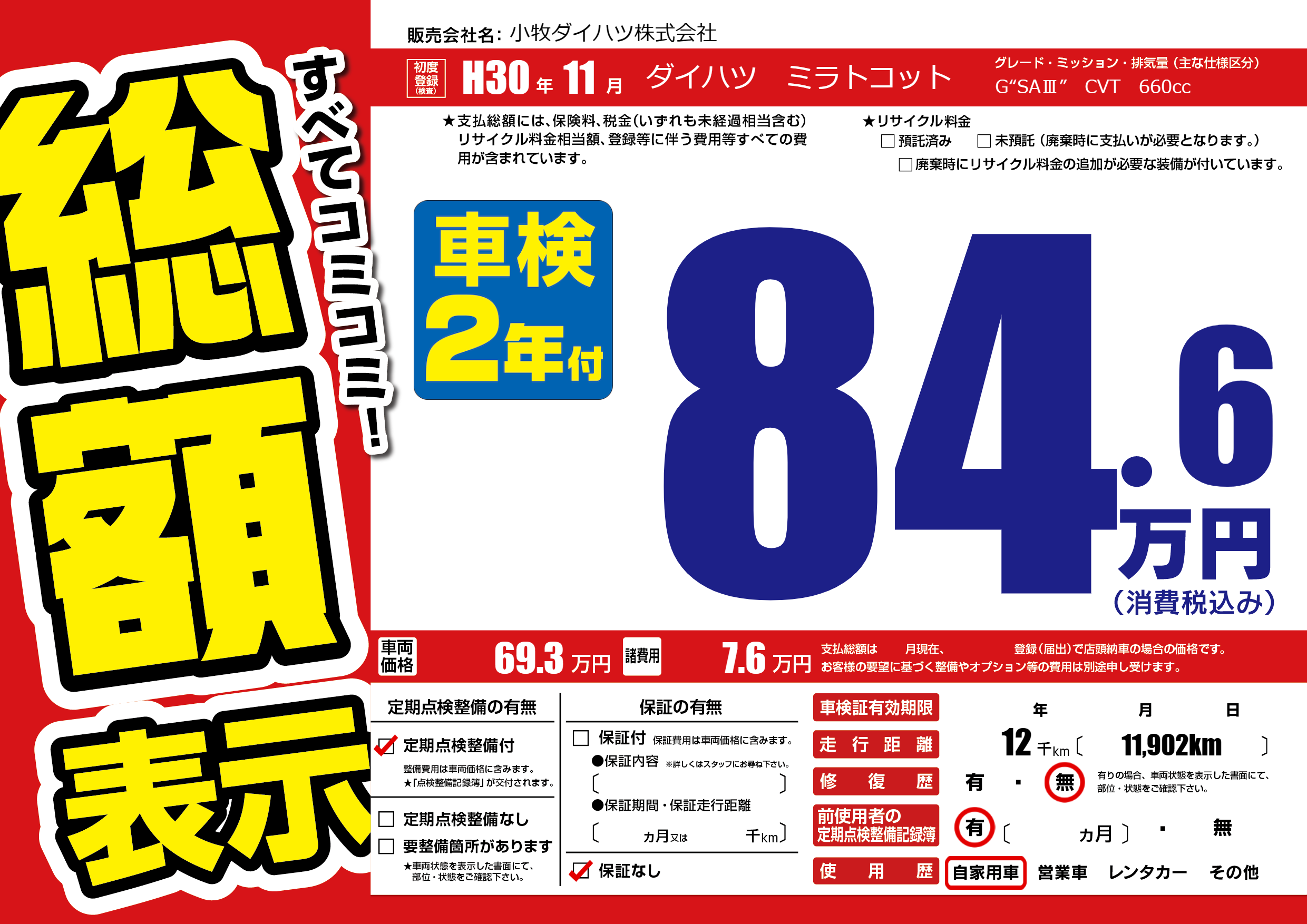 | 車名 | ダイハツ ミラトコット | グレード ミッション 排気量 |