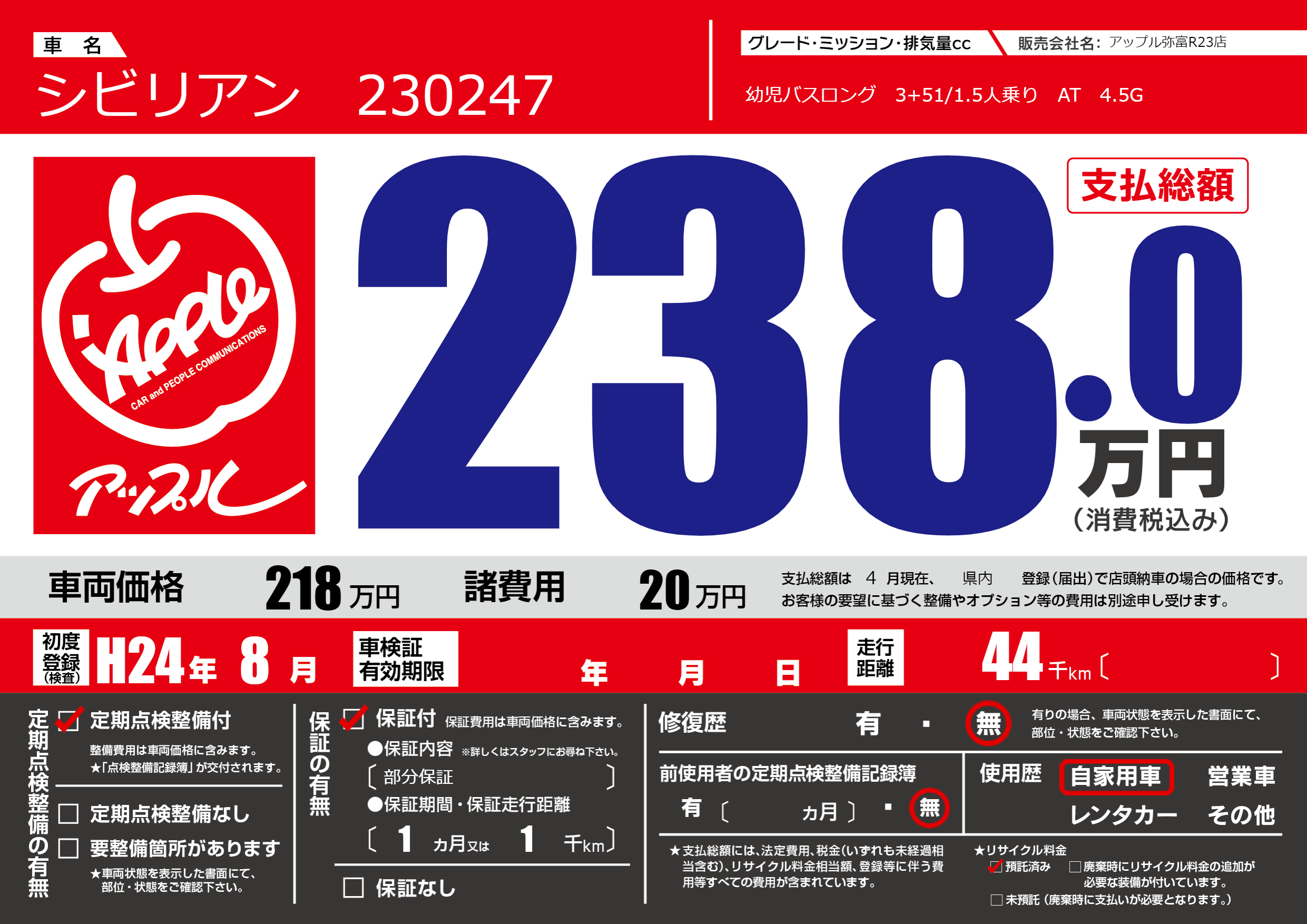 | 車名 | シビリアン 230247 | グレード ミッション 排気量 |