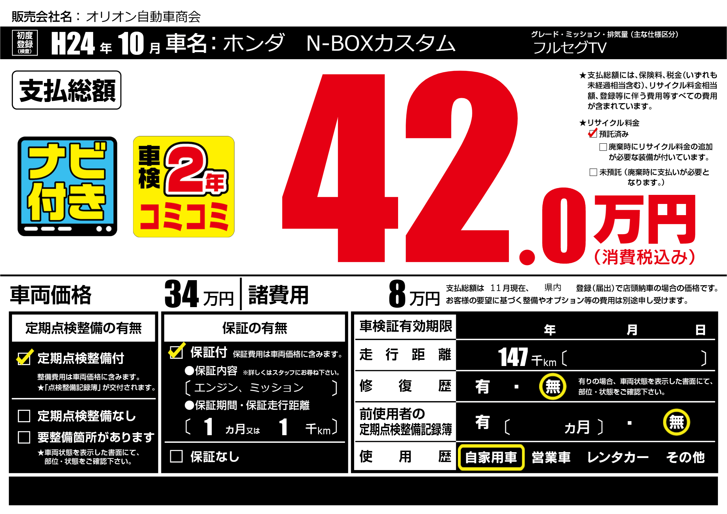 | 走行キロ | 14.7万km | 初年度登録 | H24年10月 |
