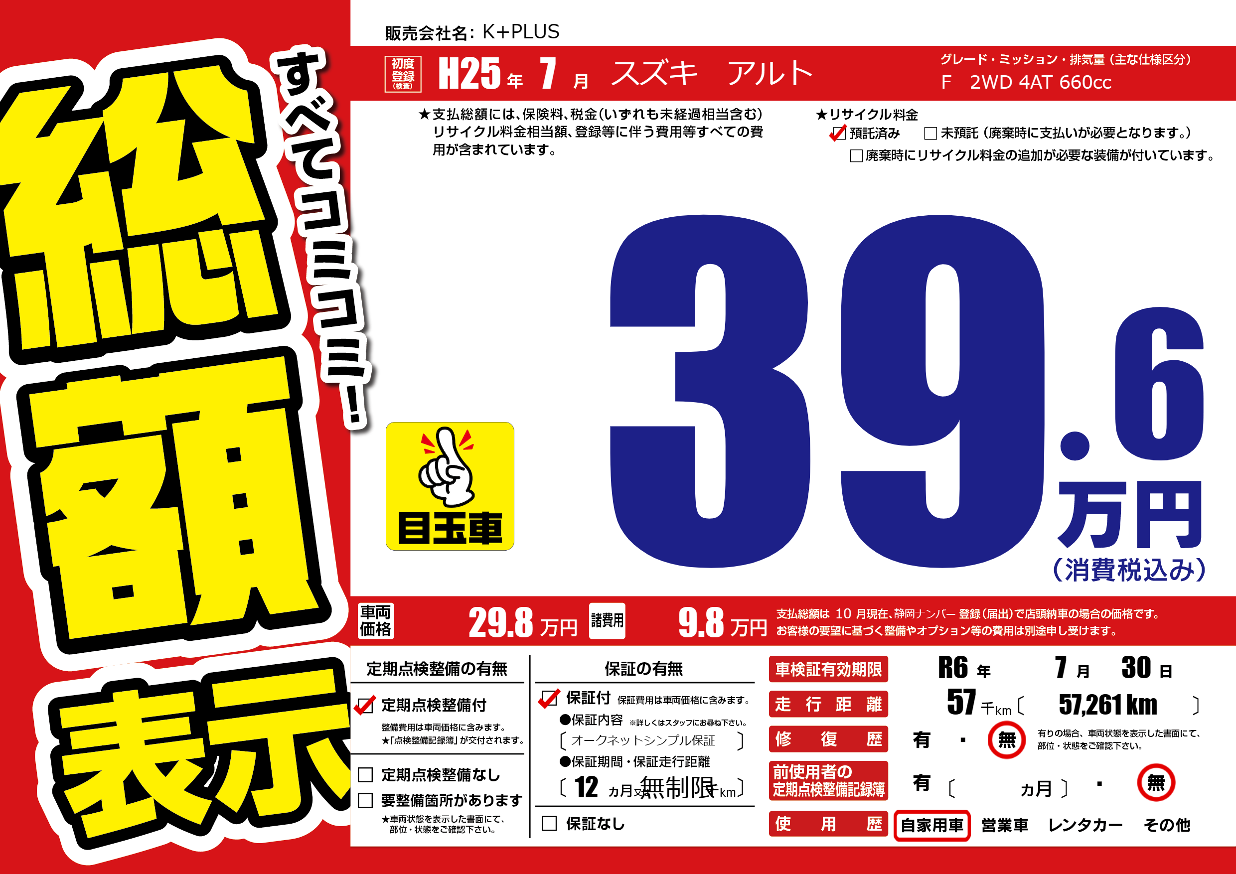 | 車名 | スズキ アルト | グレード ミッション 排気量 |