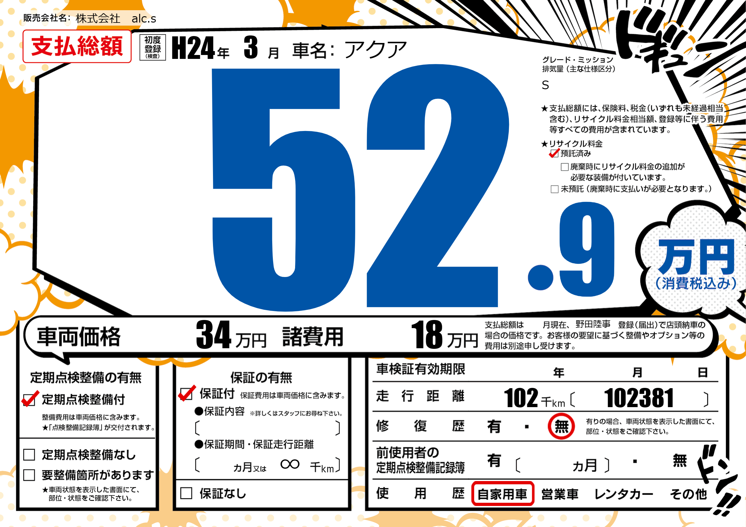 | 走行キロ | 10.2万km | 初年度登録 | H24年3月 |