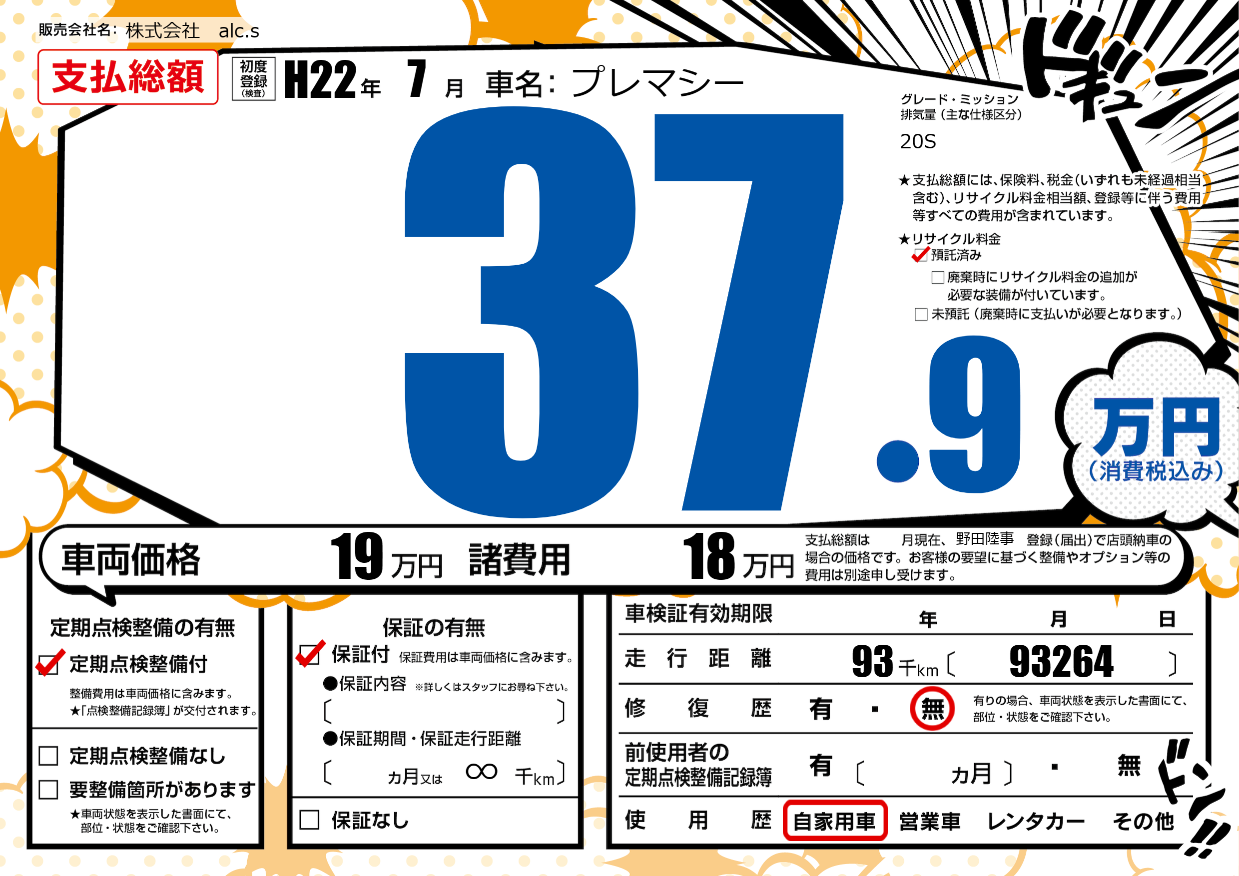 | 車名 | プレマシー | グレード ミッション 排気量 |