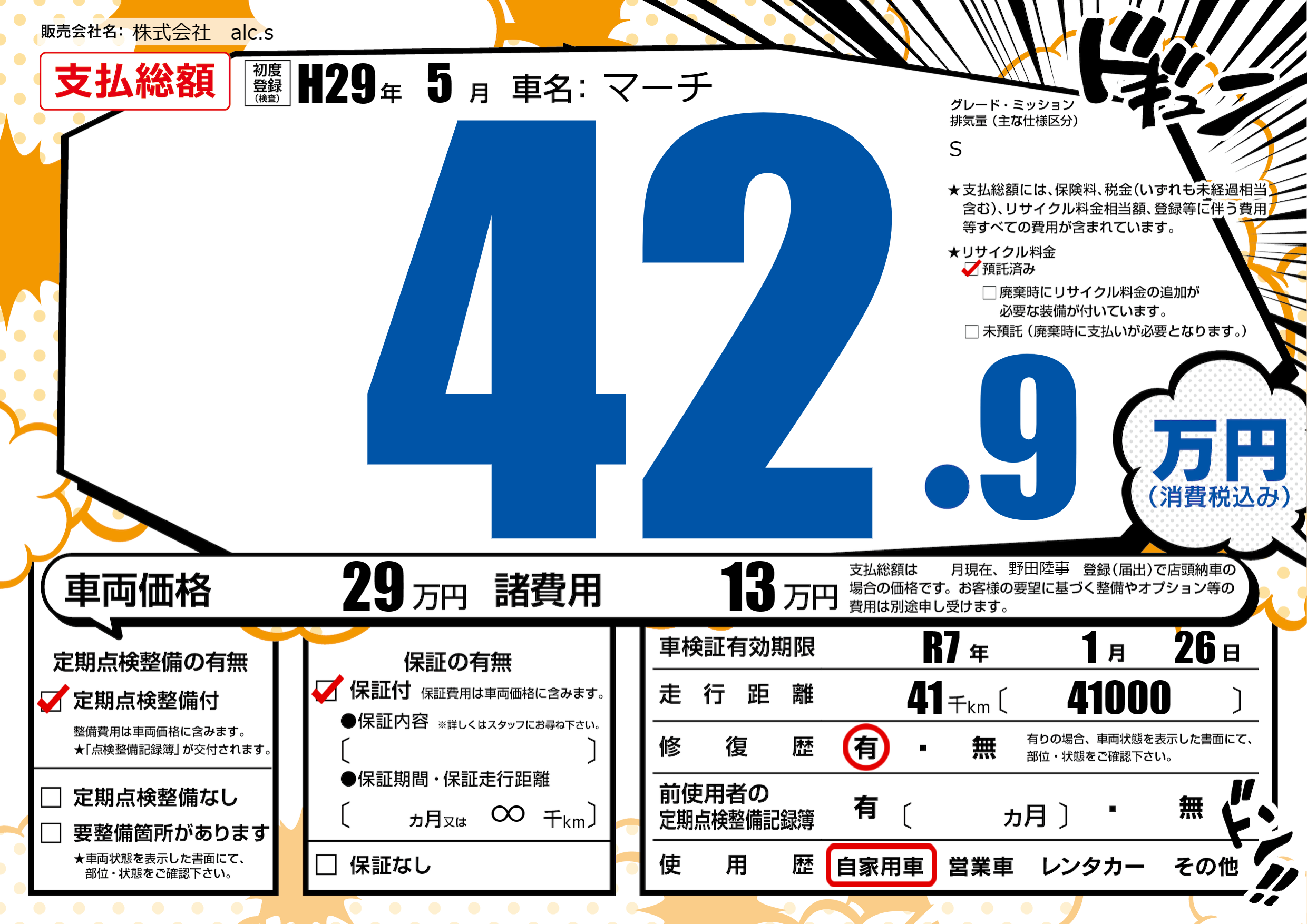 | 走行キロ | 4.1万km | 初年度登録 | H29年5月 |