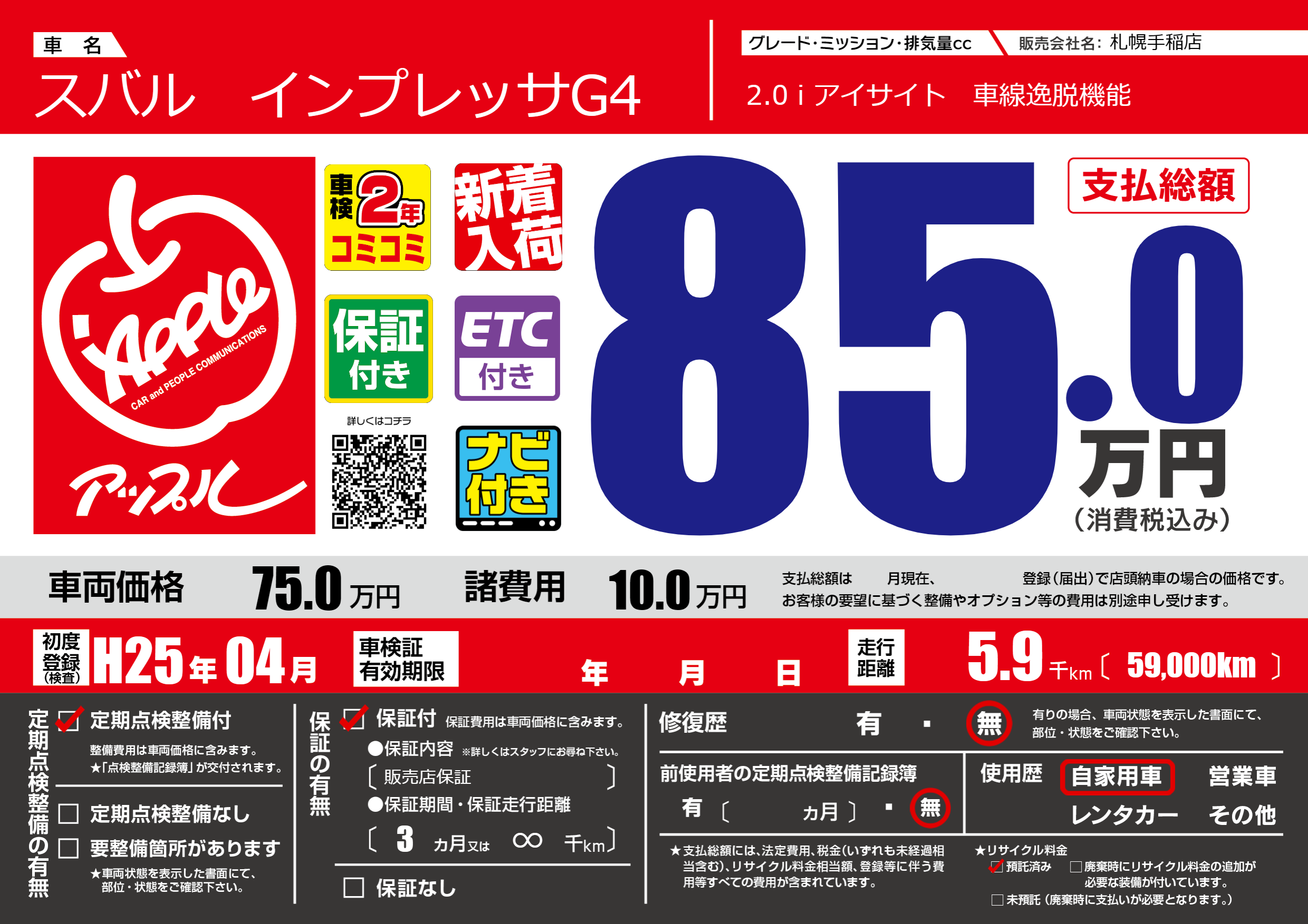 | 車名 | スバル インプレッサG4 | グレード ミッション 排気量 |