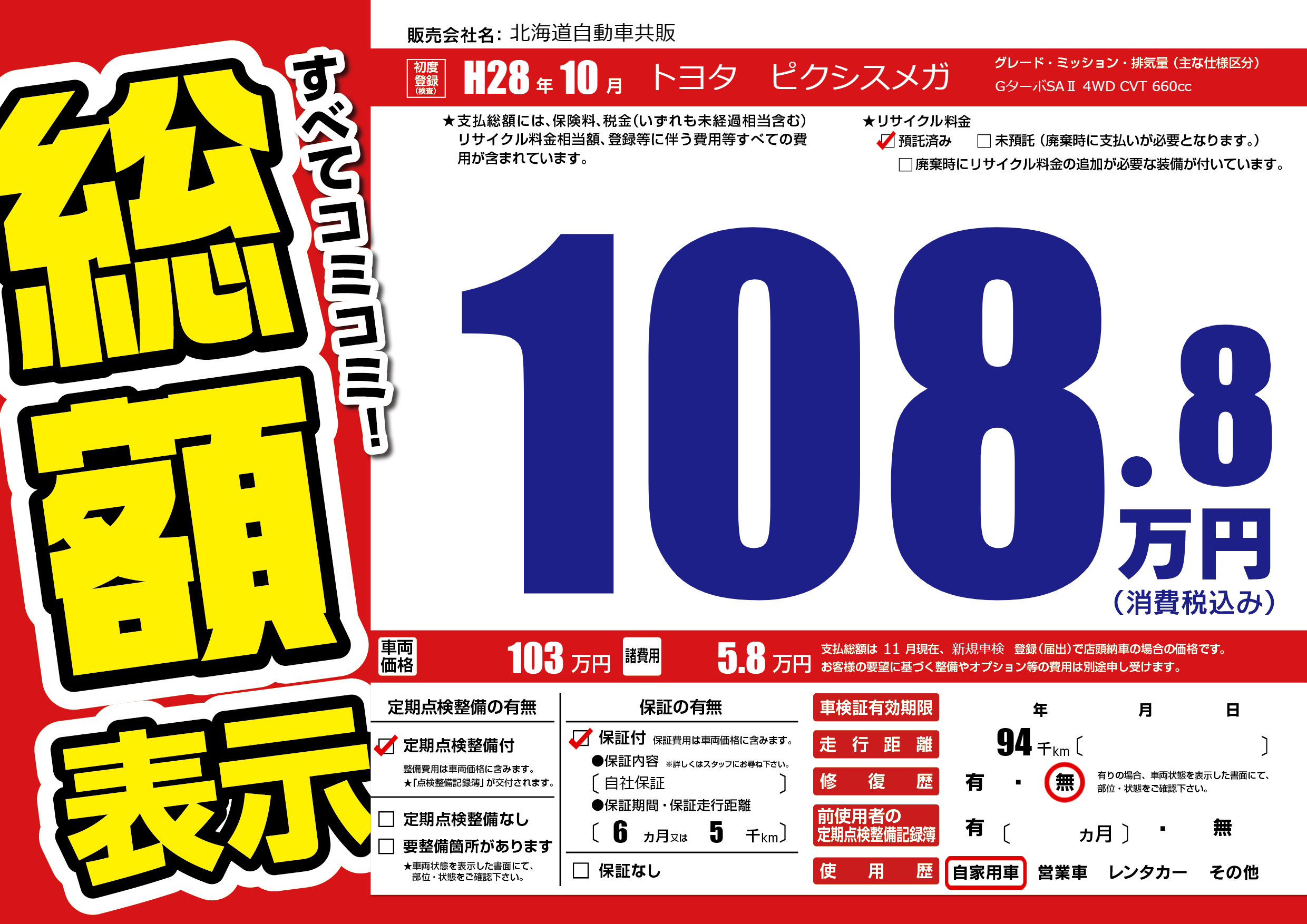 | 走行キロ | 9.4万km | 初年度登録 | H28年10月 |