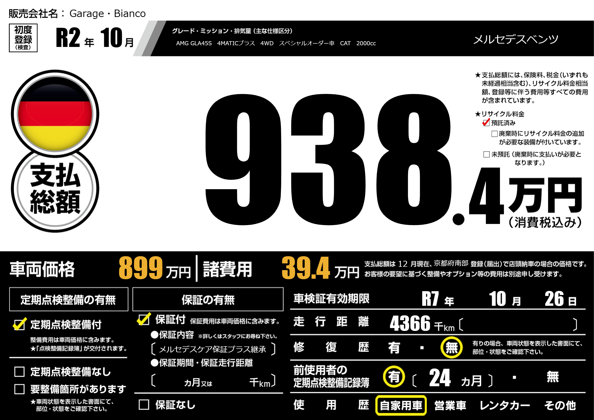 保証付き 保証内容(メルセデスケア保証プラス継承) ---ヶ月または()千kmまで |