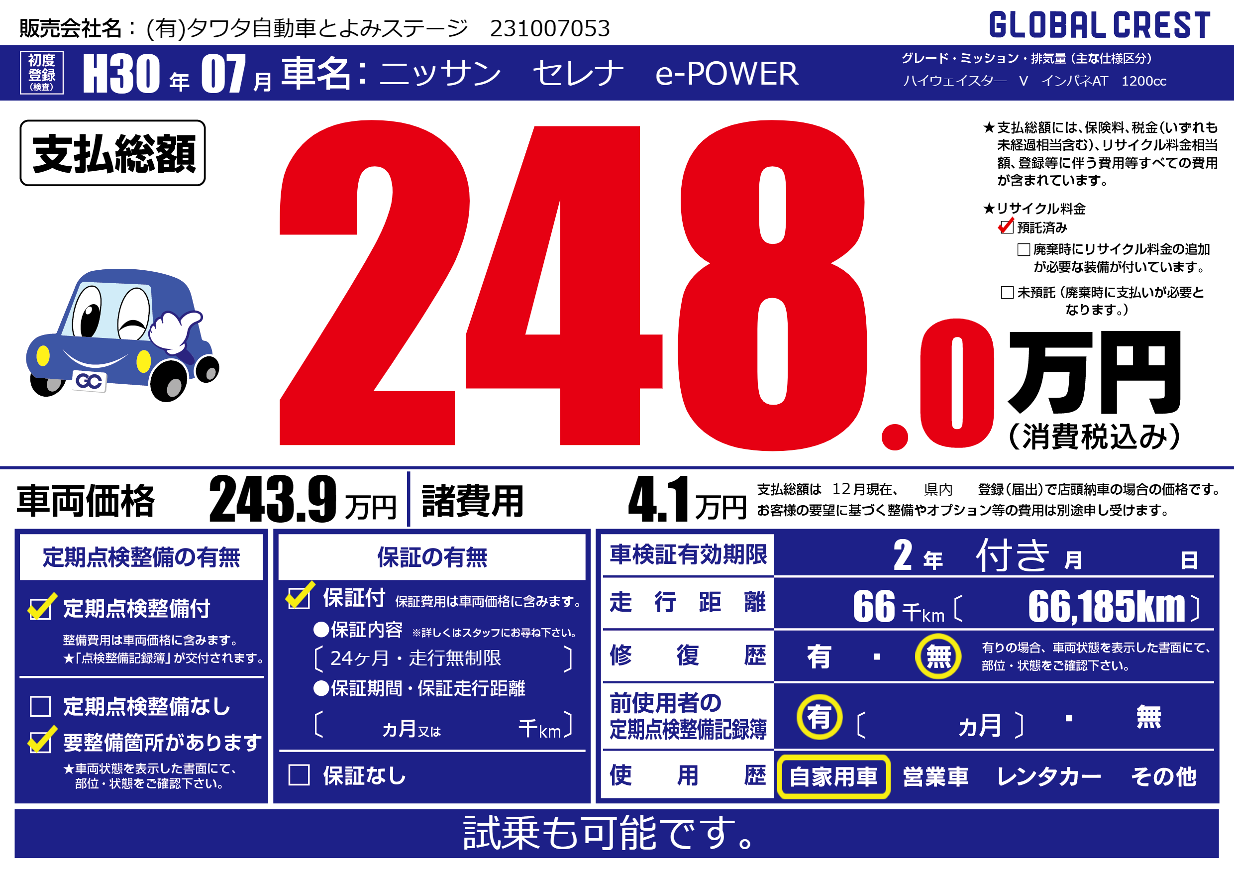 | 車検制限 | 2年 付き月 - 日 | ||