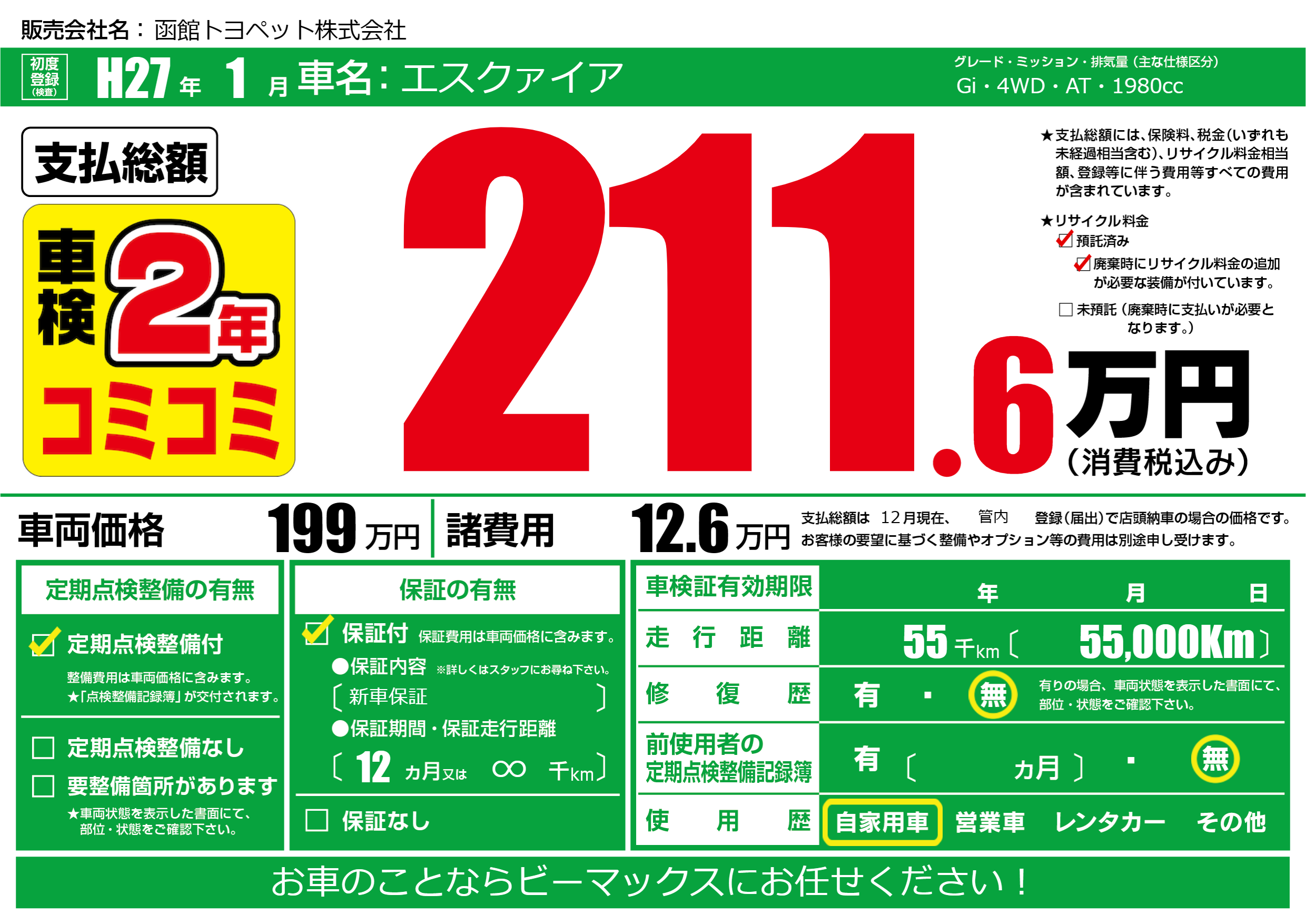 | 走行キロ | 5.5万km | 初年度登録 | H27年1月 |