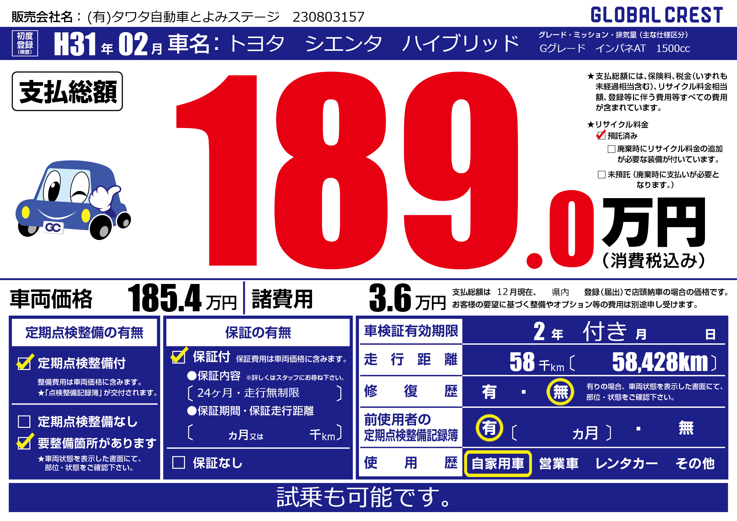 | 車名 | トヨタ シエンタ ハイブリッド | グレード ミッション 排気量 |
