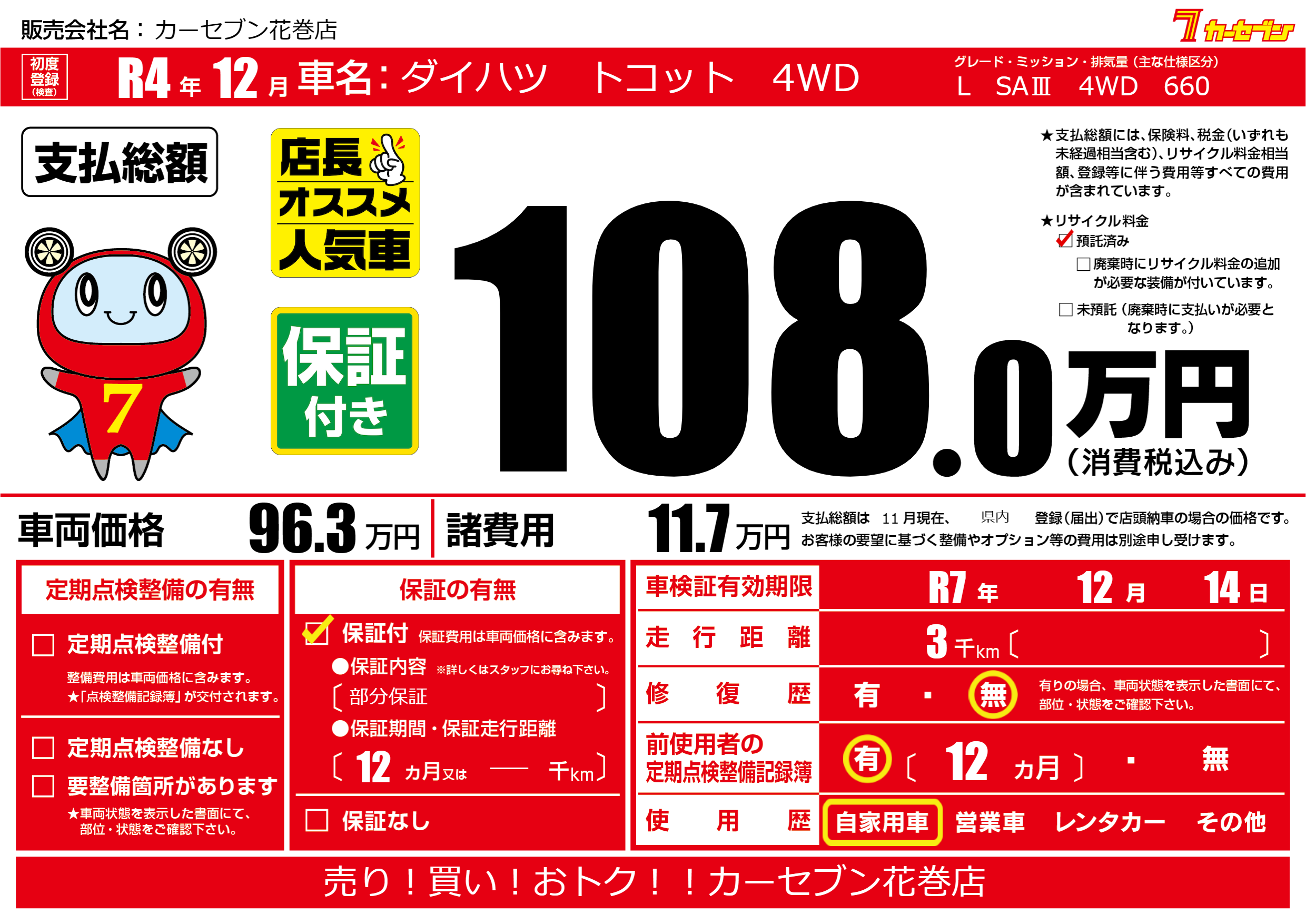 | 車名 | ダイハツ トコット 4WD | グレード ミッション 排気量 |