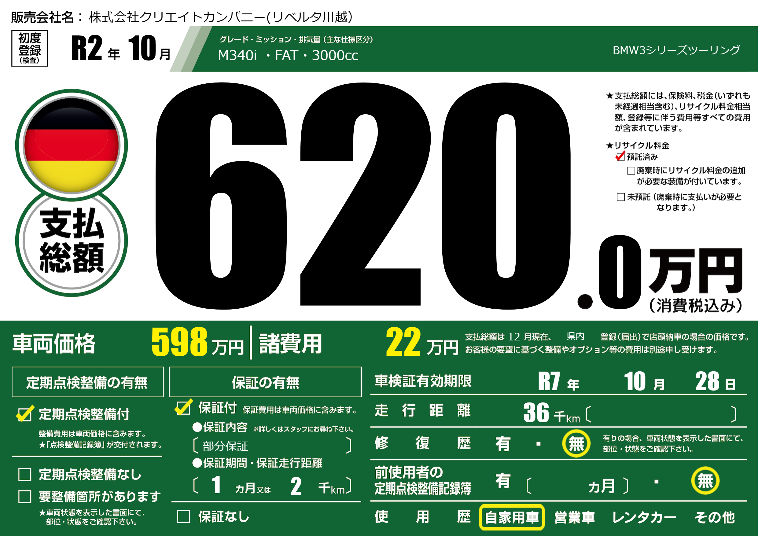 | 車名 | BMW3シリーズツーリング | グレード ミッション 排気量 |