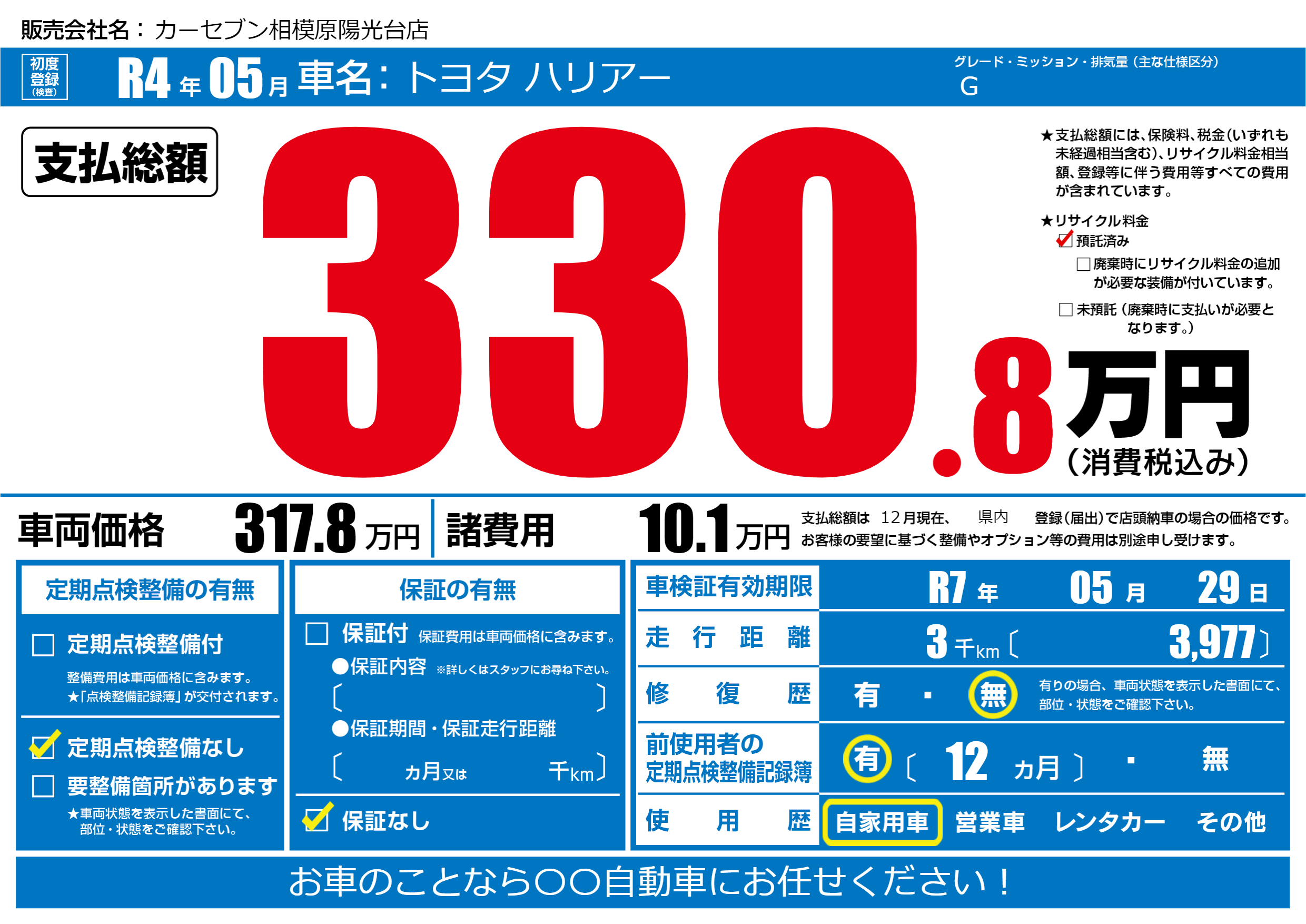 | 走行キロ | 0.3万km | 初年度登録 | R4年05月 |