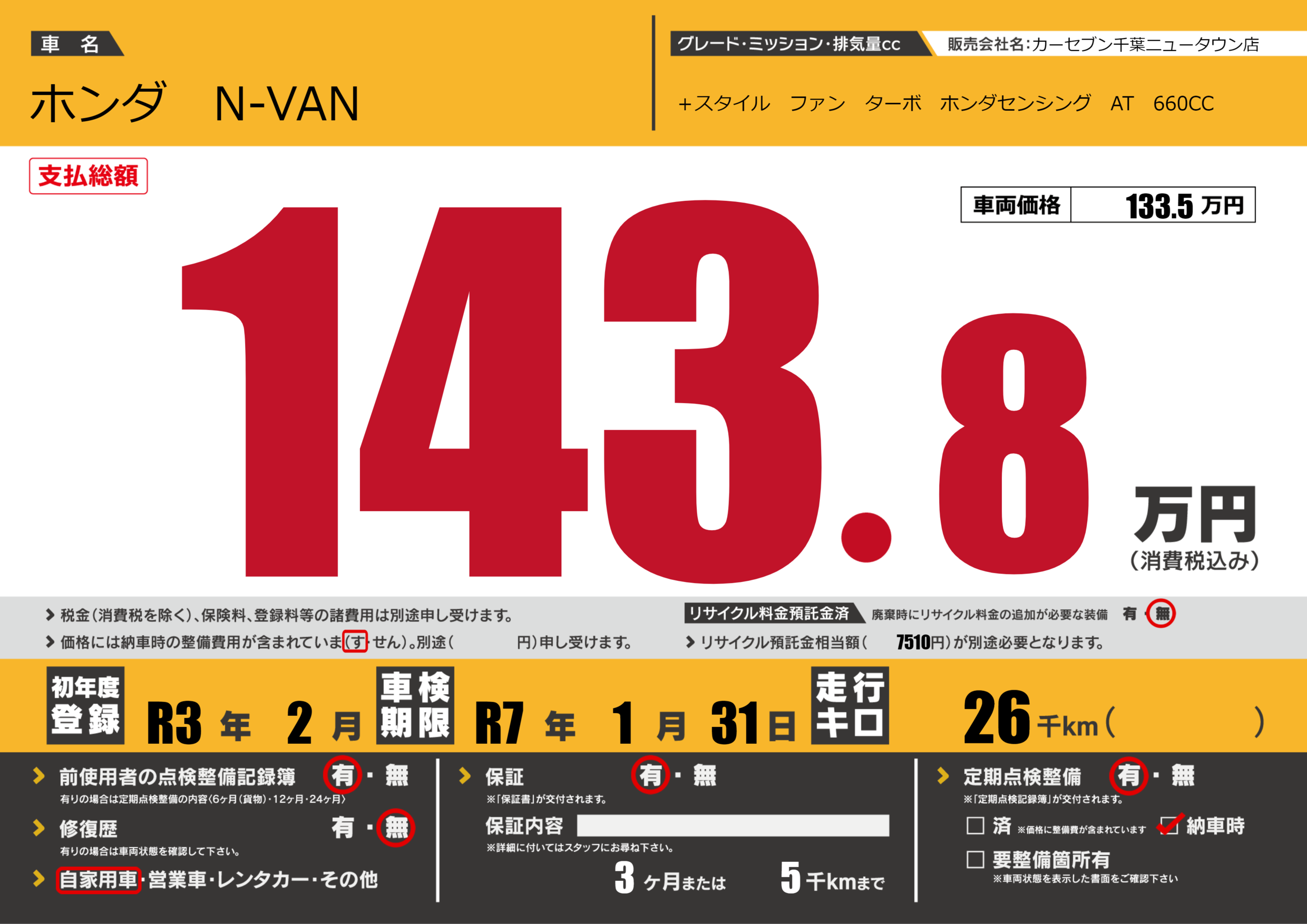 保証付き 保証内容(---) 3ヶ月または(5)千kmまで |
