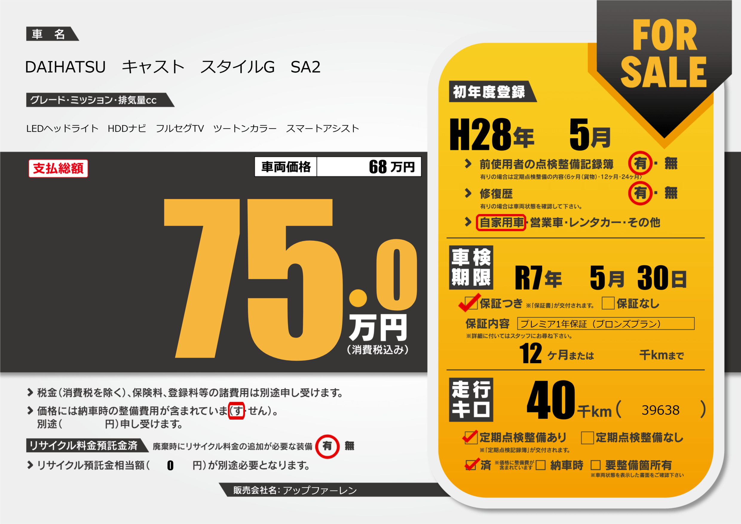 | 走行キロ | 4万km | 初年度登録 | H28年5月 |