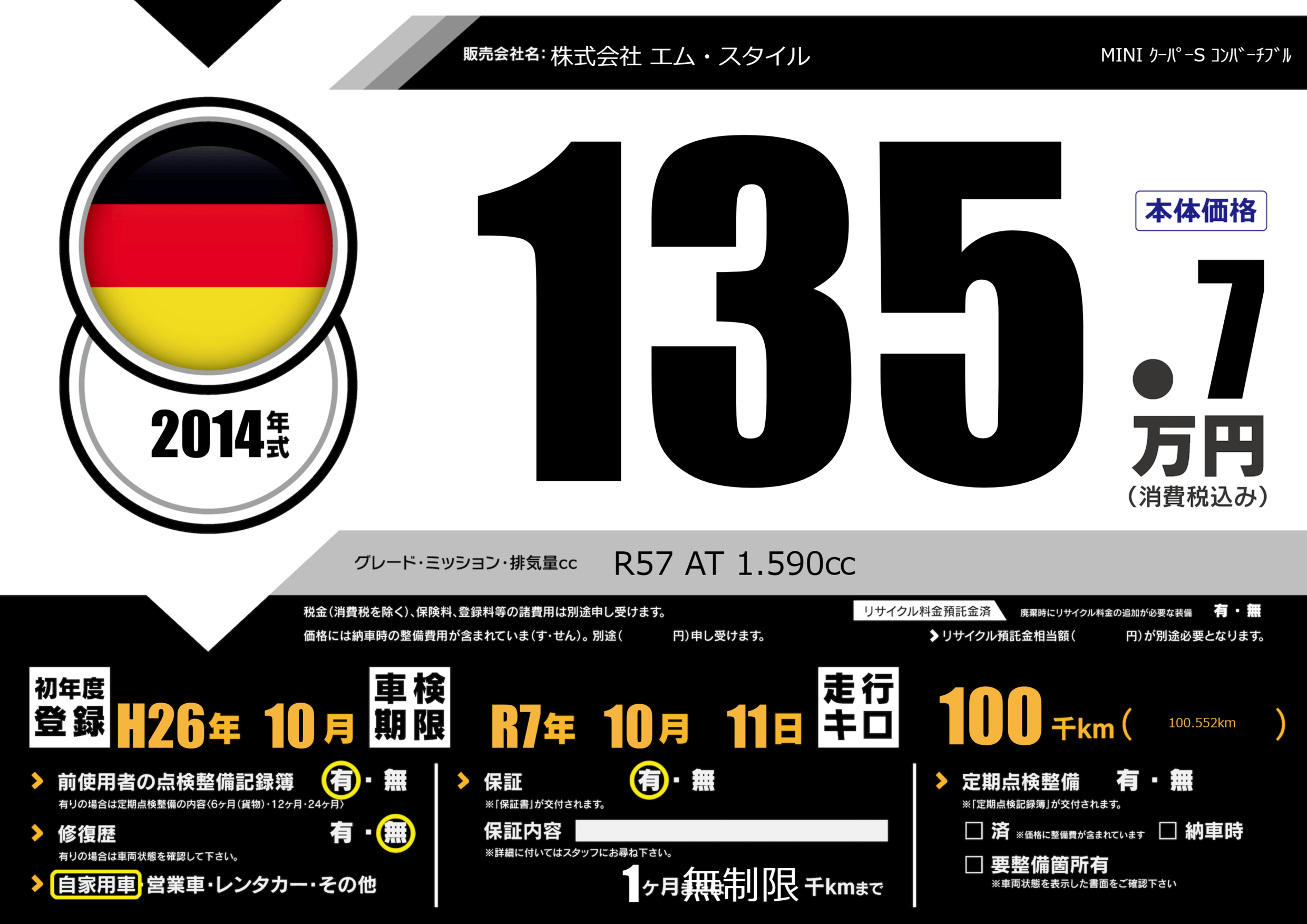 | 走行キロ | 10万km | 初年度登録 | H26年10月 |