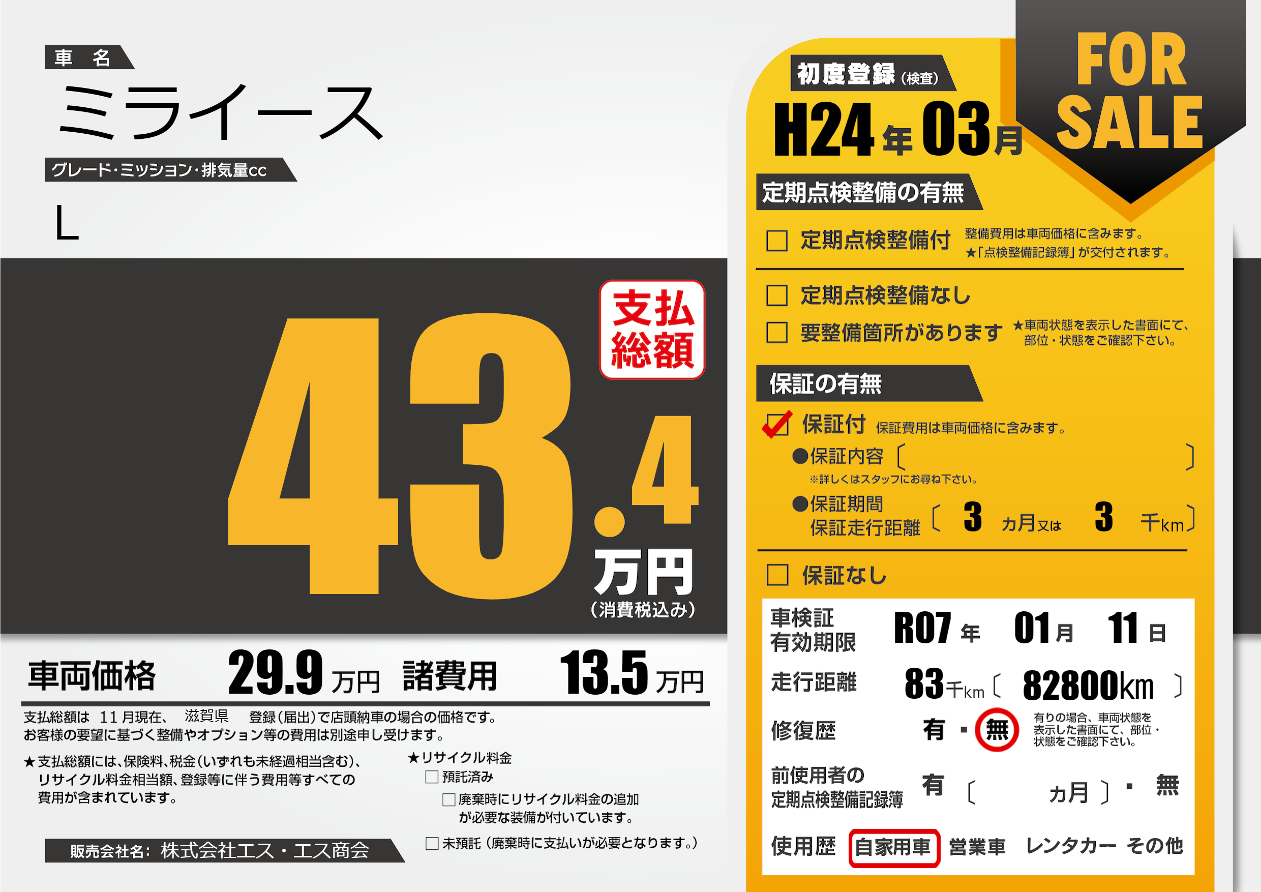 | 走行キロ | 8.3万km | 初年度登録 | H24年03月 |