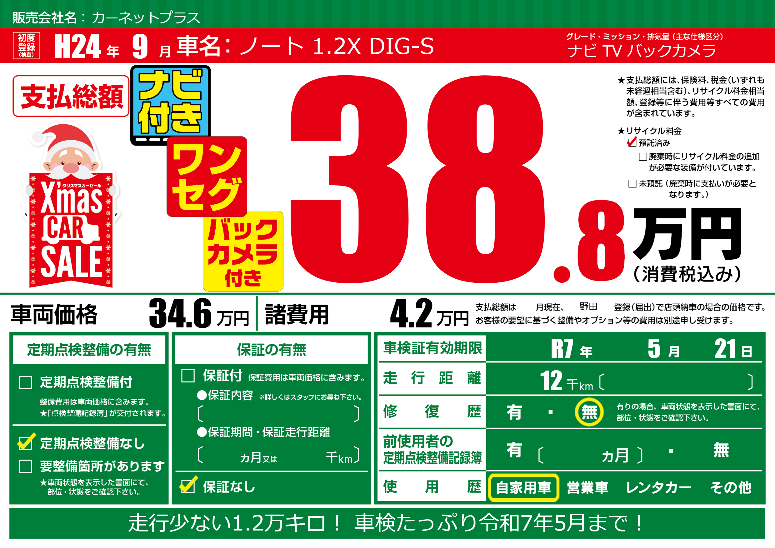 | 車名 | ノート 1.2X DIG-S | グレード ミッション 排気量 |