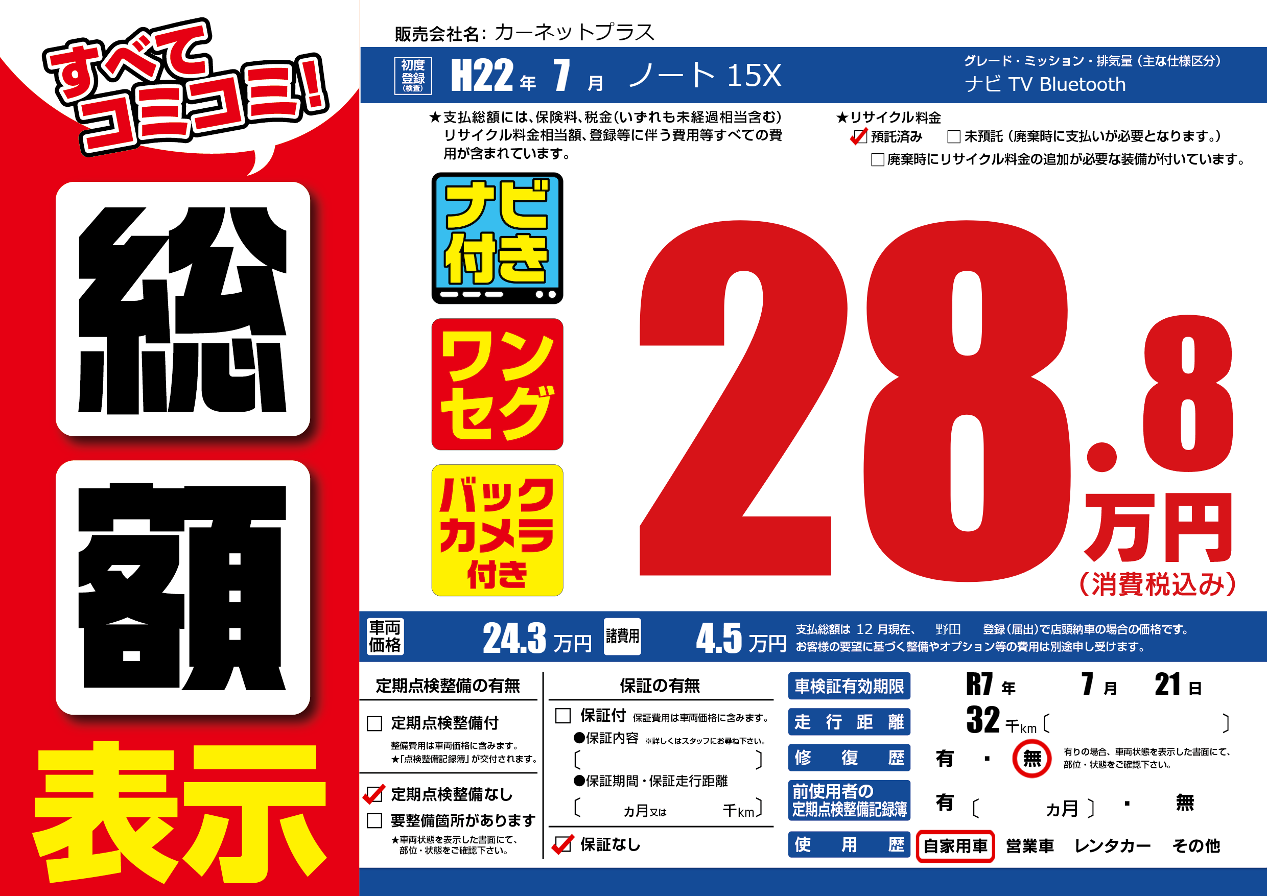 | 車名 | ノート 15X | グレード ミッション 排気量 |
