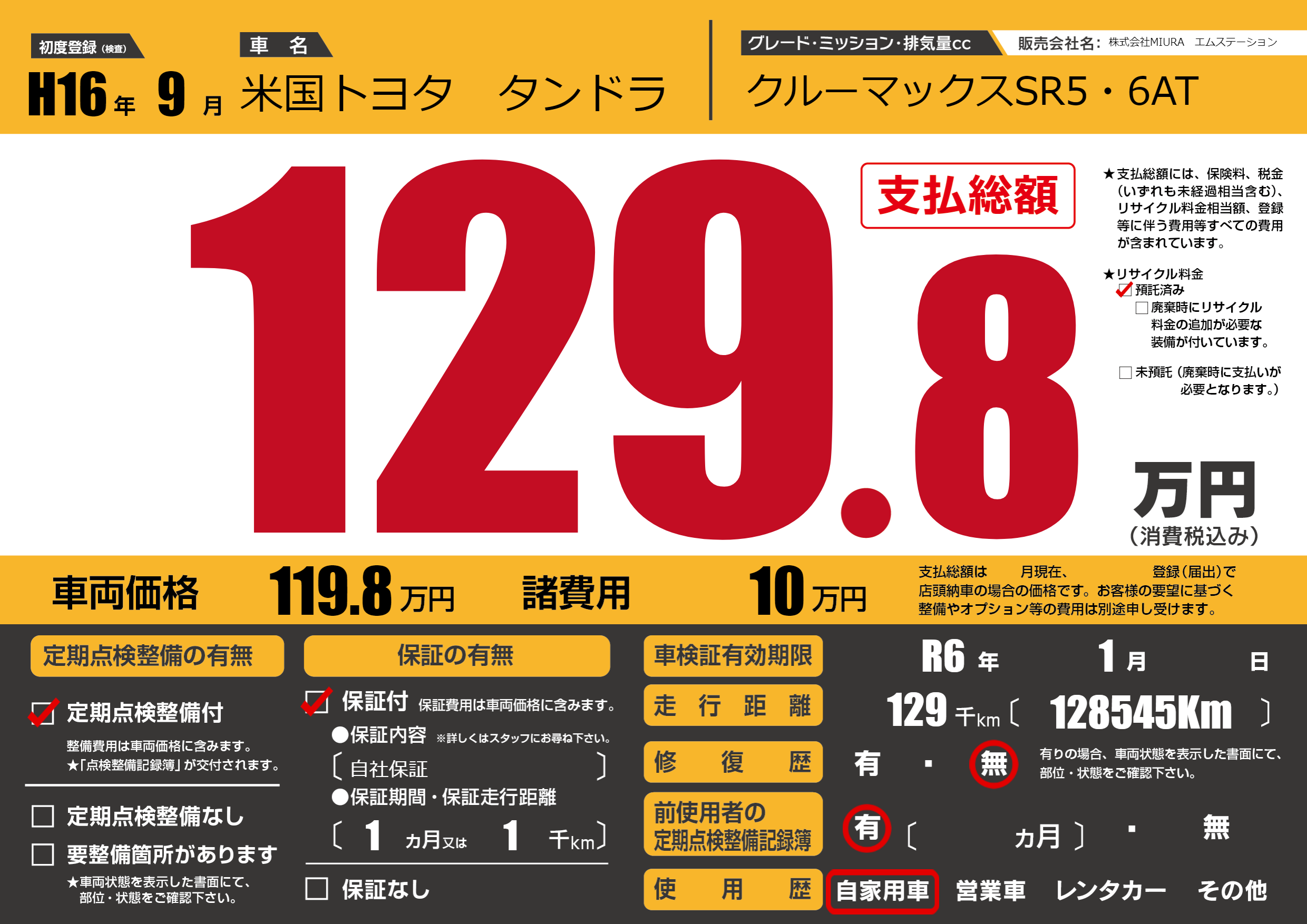 | 走行キロ | 12.9万km | 初年度登録 | H16年9月 |