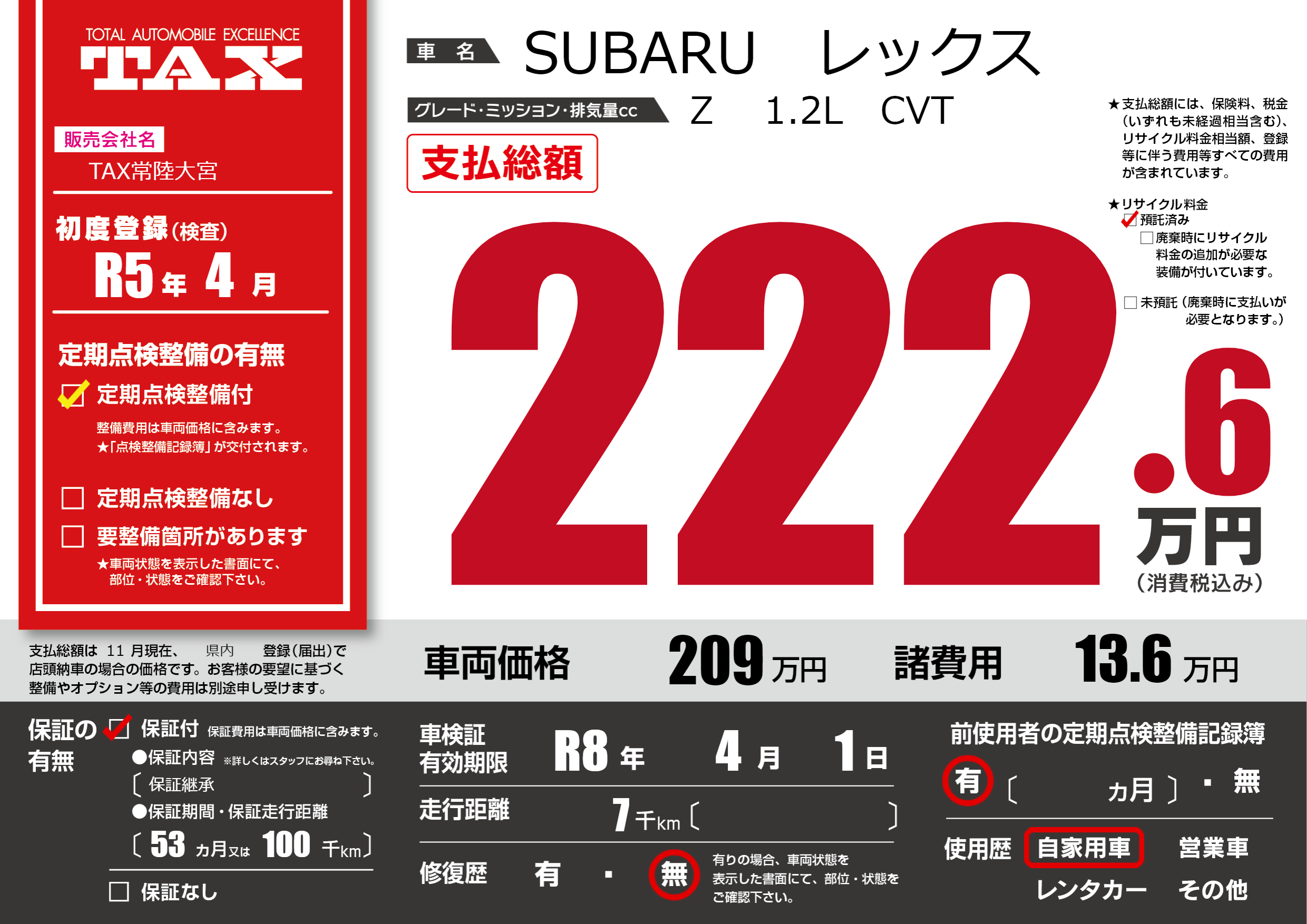 保証付き 保証内容(保証継承) 53ヶ月または(100)千kmまで |