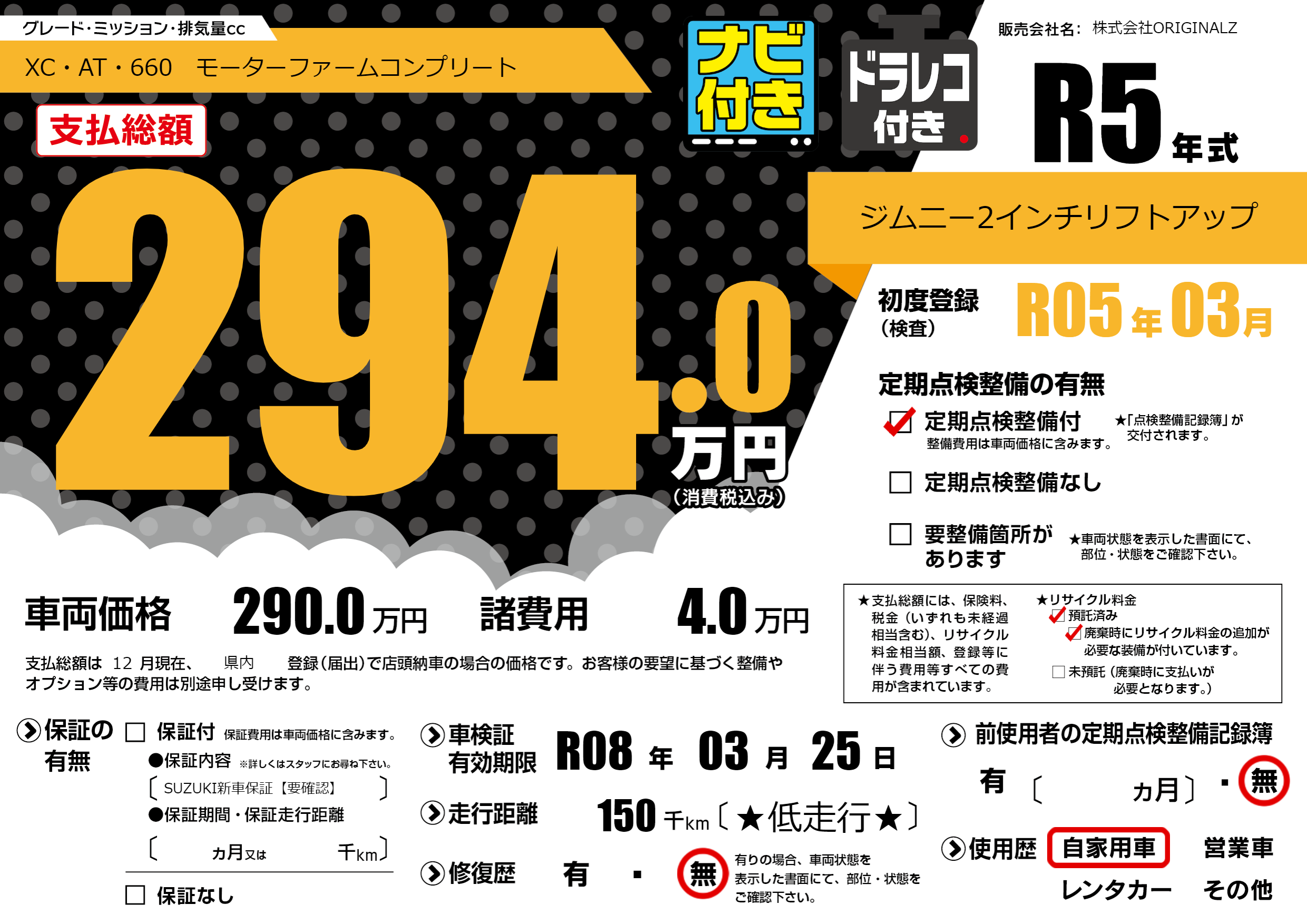 | 走行キロ | 15万km | 初年度登録 | R05年03月 |