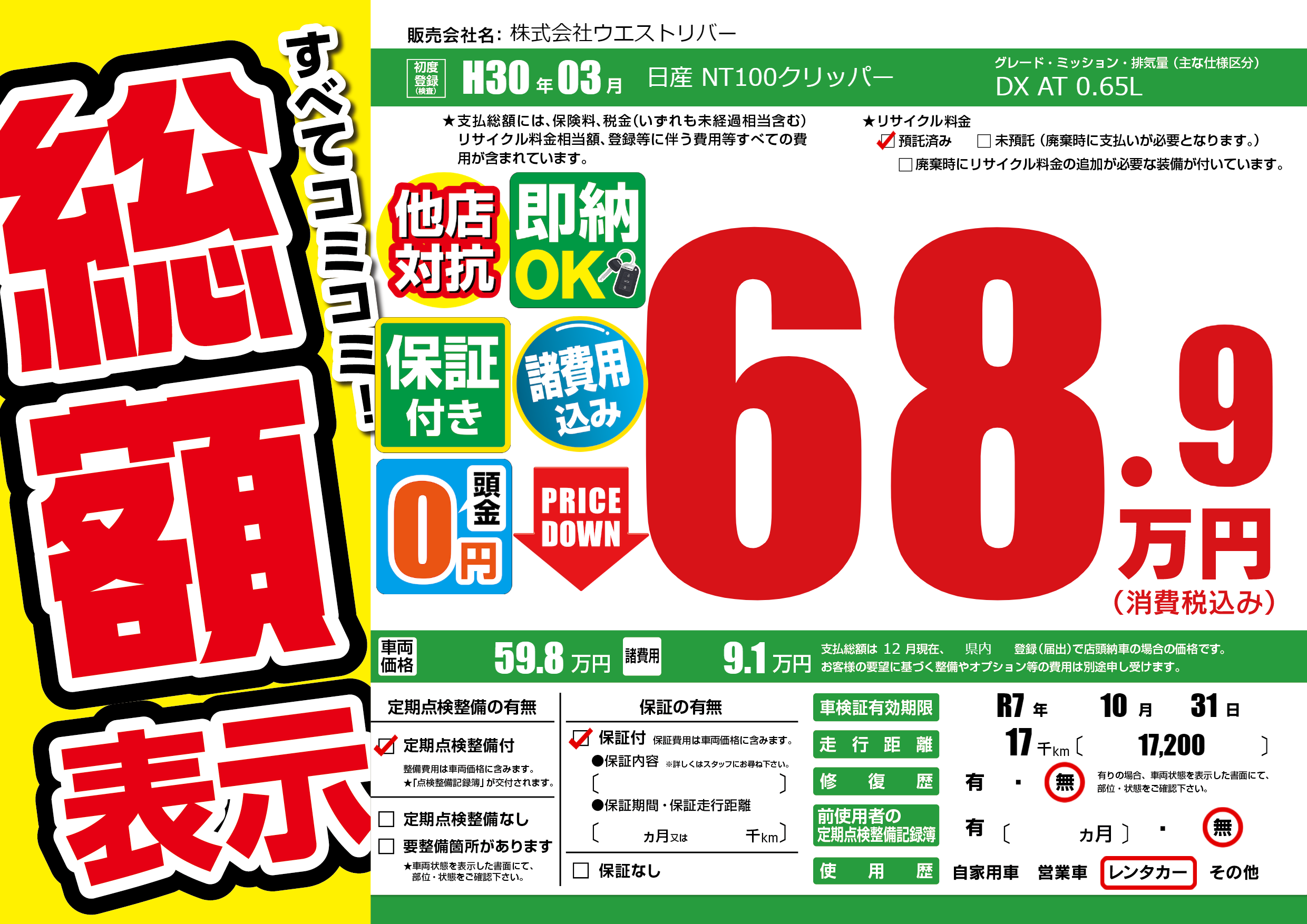 | 走行キロ | 1.7万km | 初年度登録 | H30年03月 |