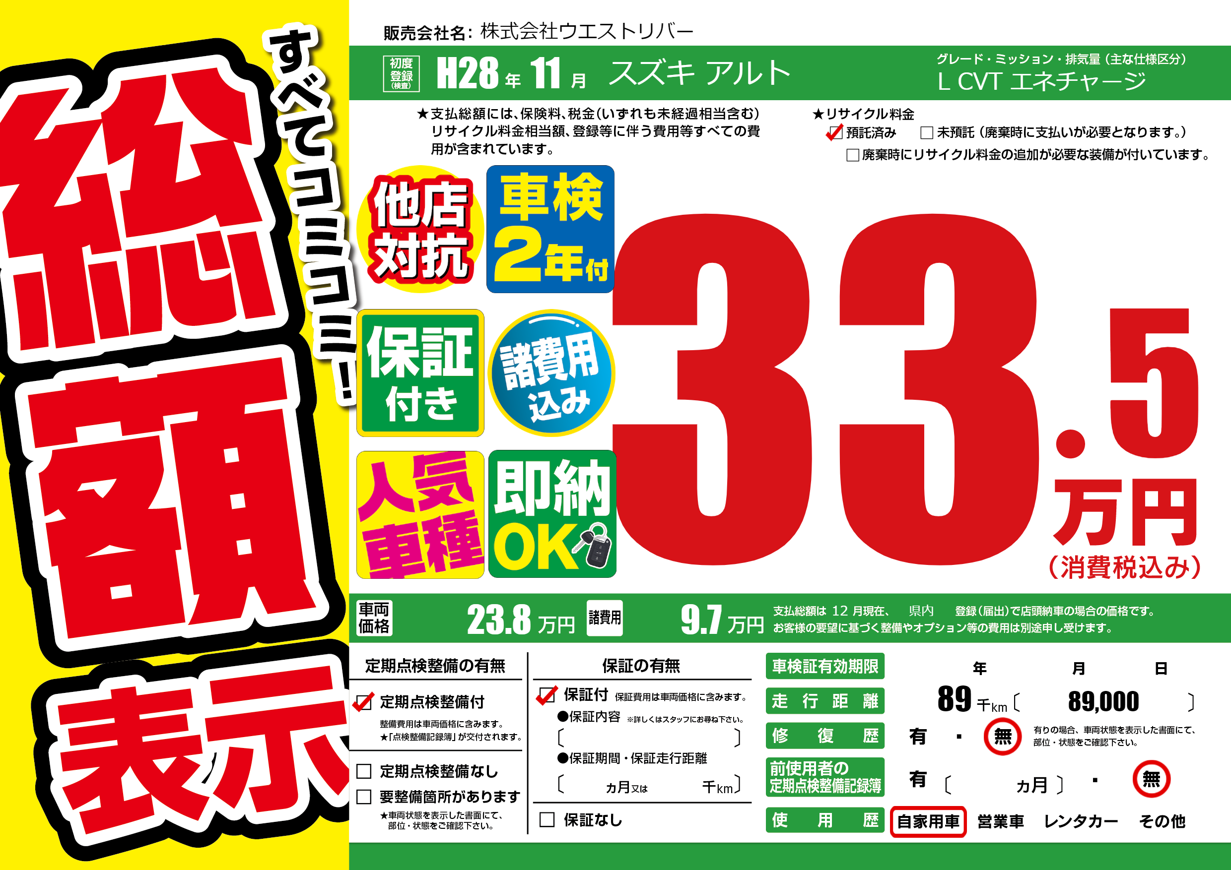 | 車名 | スズキ アルト | グレード ミッション 排気量 |