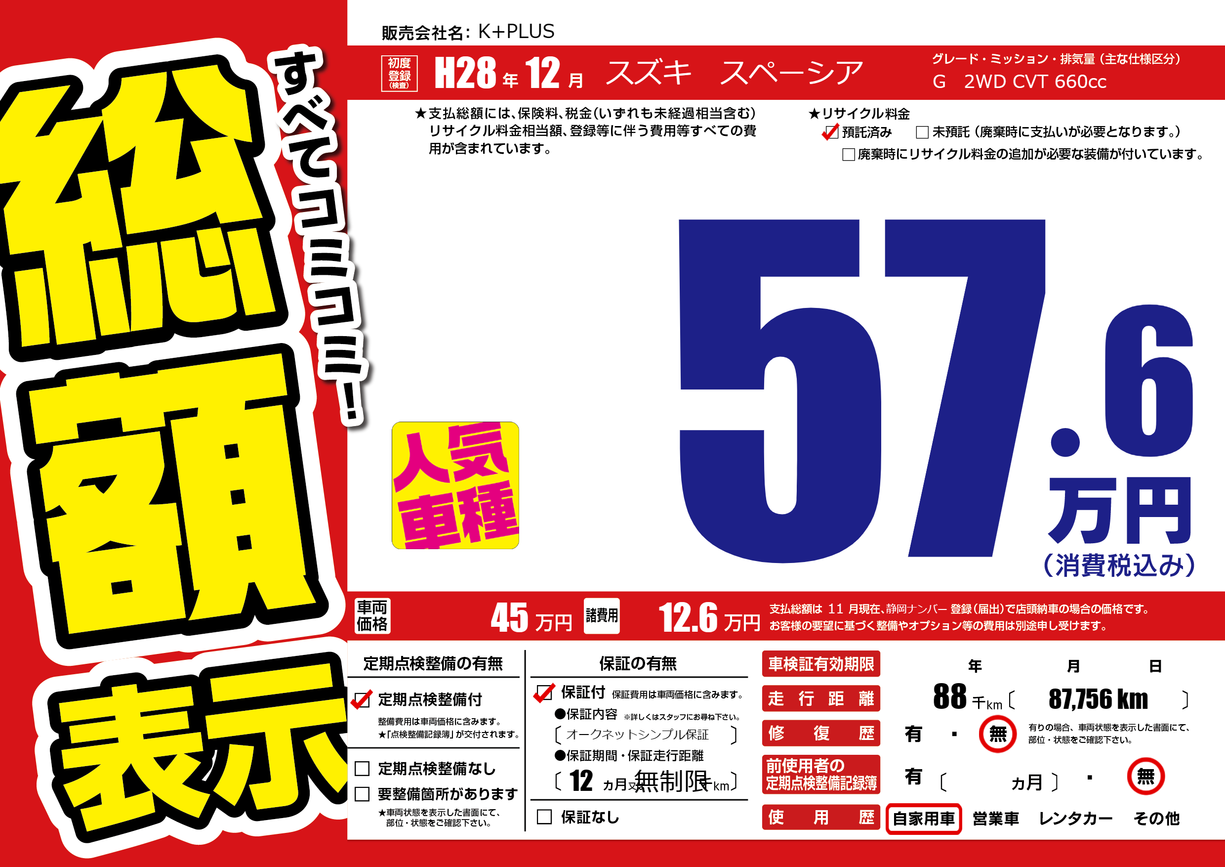 | 走行キロ | 8.8万km | 初年度登録 | H28年12月 |