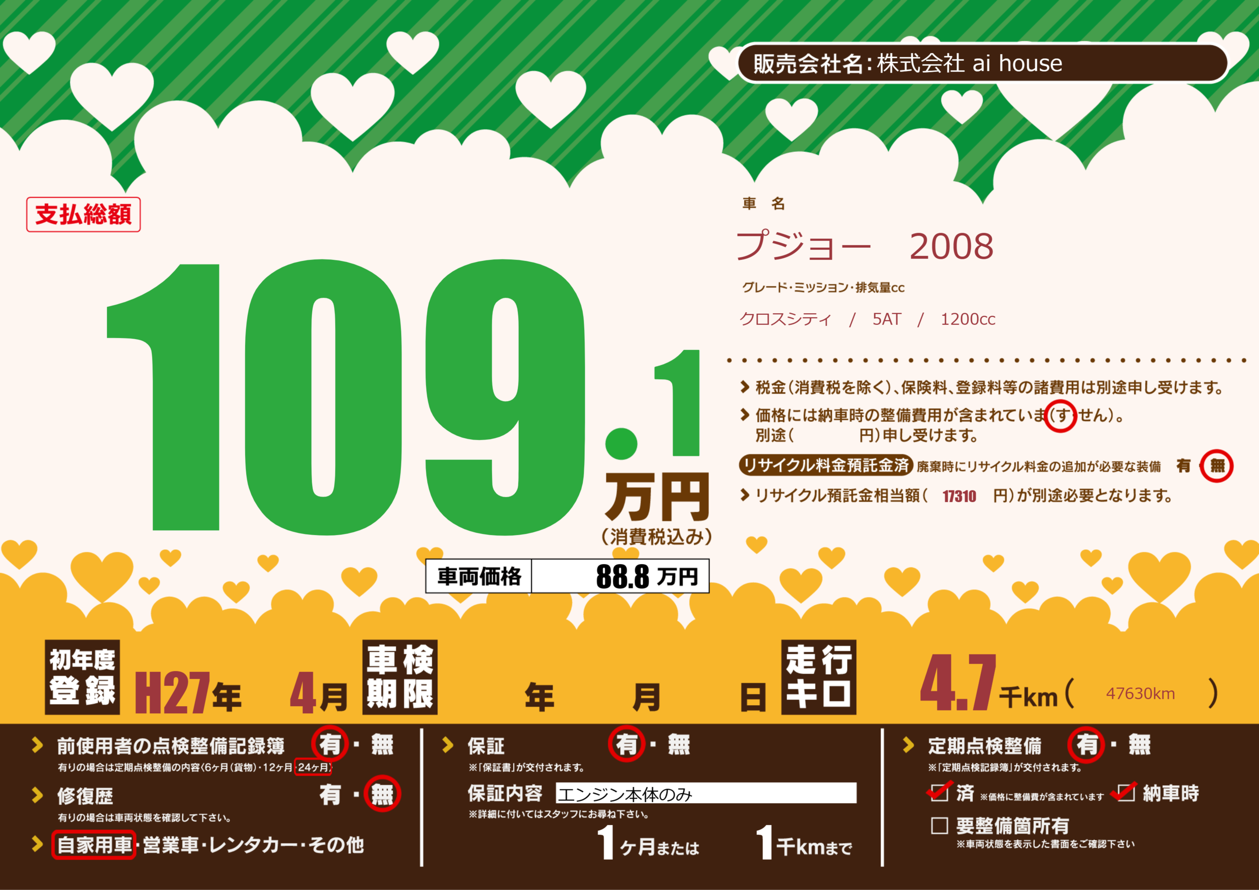 | 定期点検整備 | 定期点検整備あり 定期点検整備済み 納車時あり | ||