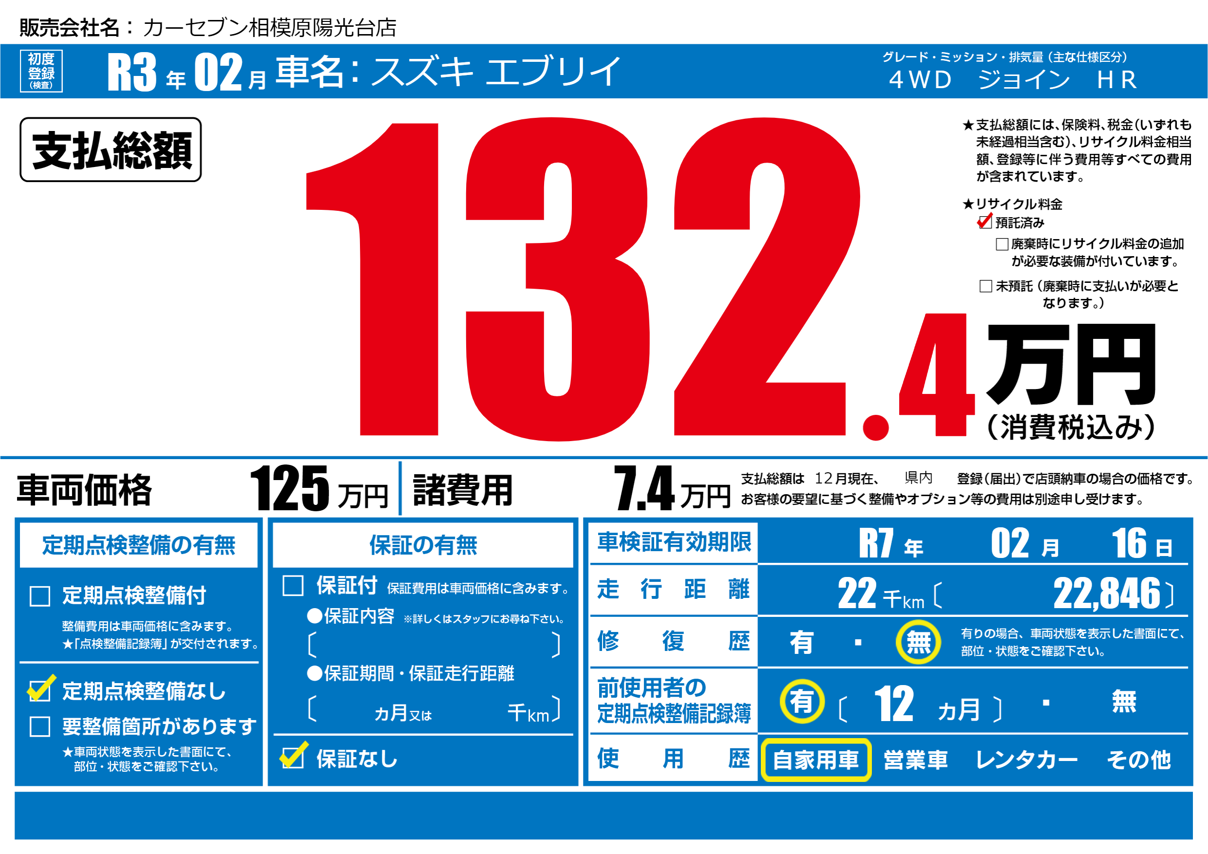 | 走行キロ | 2.2万km | 初年度登録 | R3年02月 |
