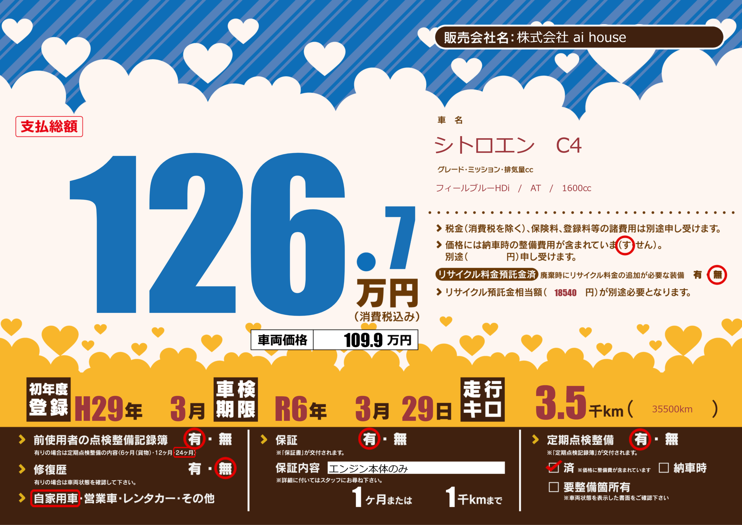 | 定期点検整備 | 定期点検整備あり 定期点検整備済み | ||
