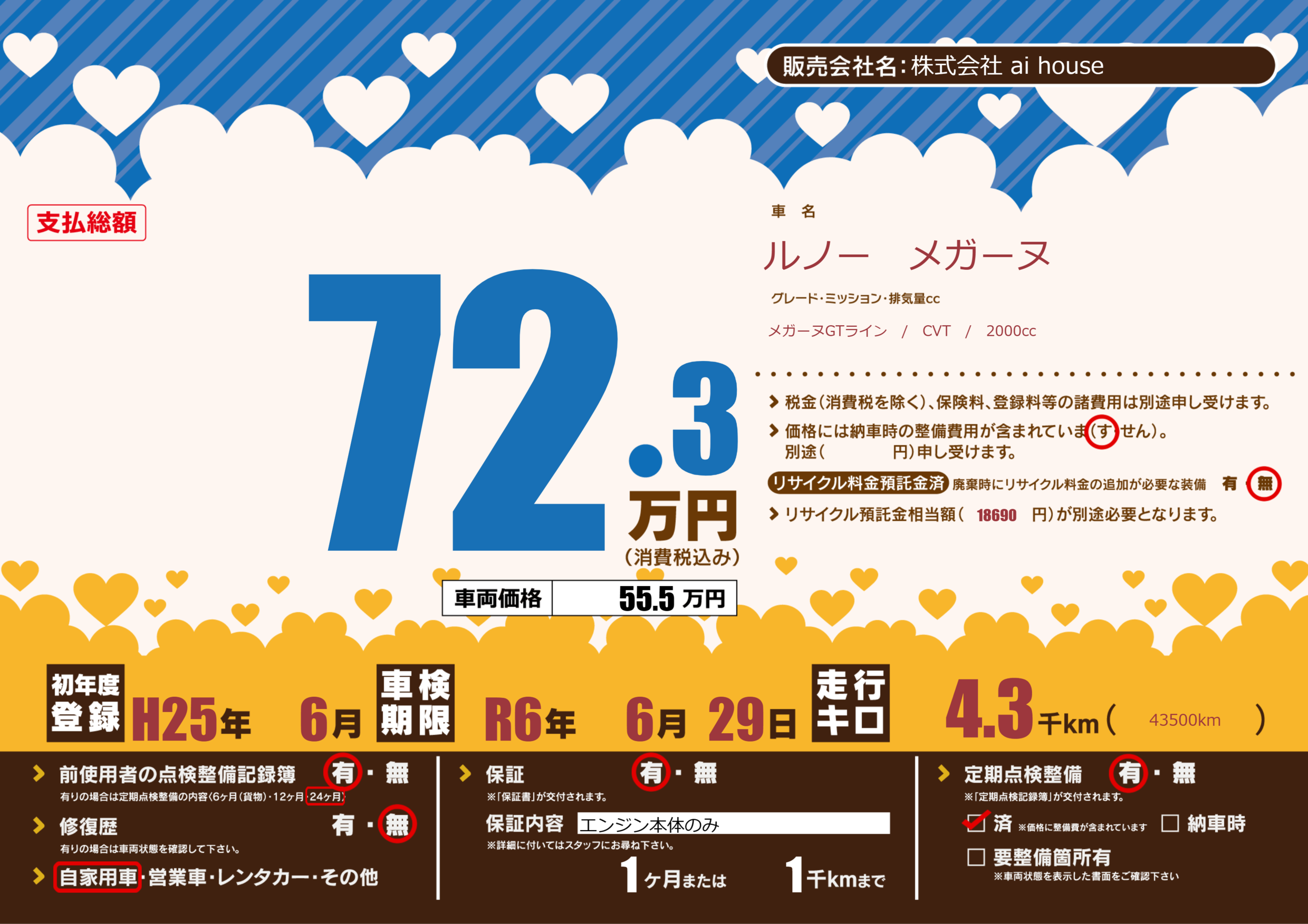 | 定期点検整備 | 定期点検整備あり 定期点検整備済み | ||