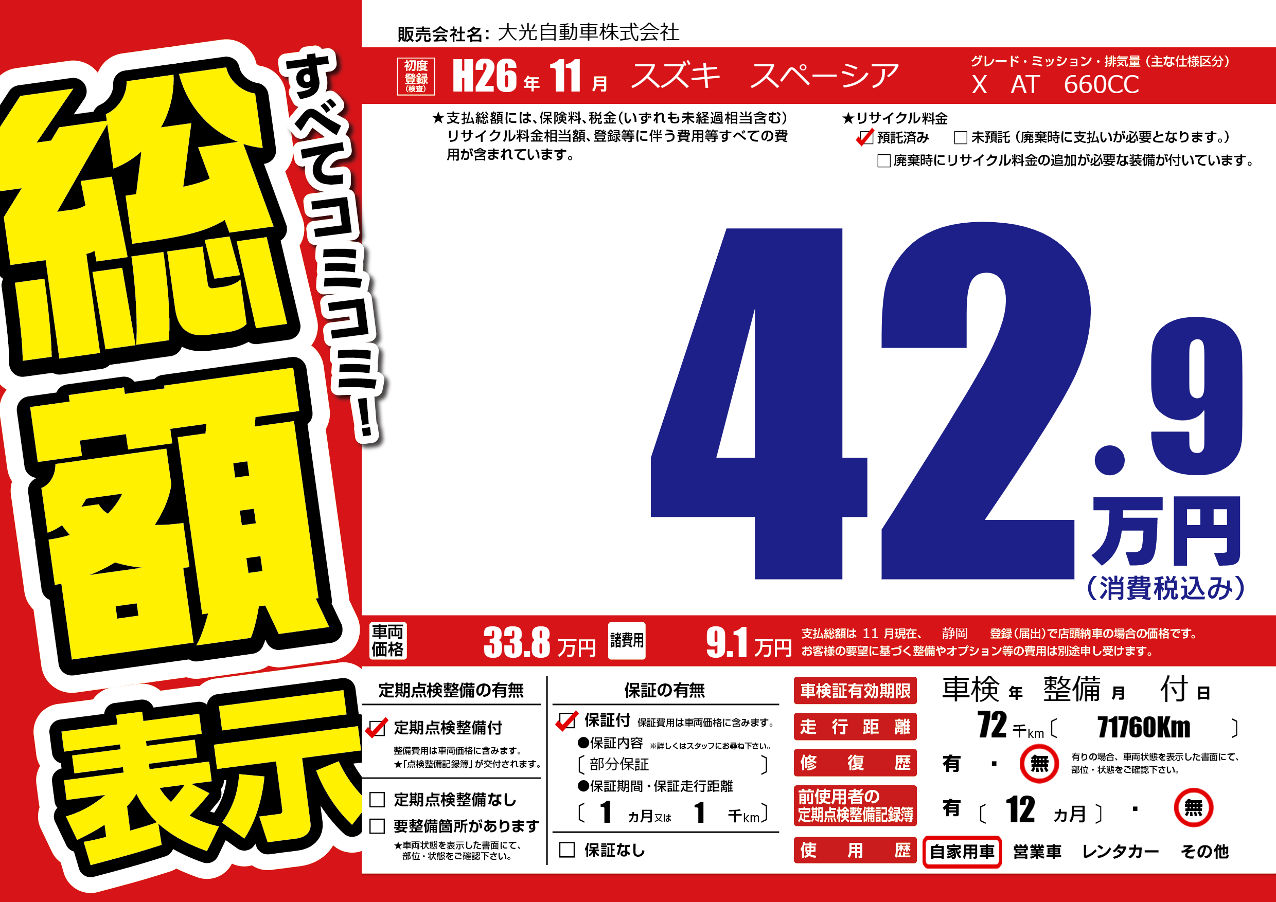 | 車名 | スズキ スペーシア | グレード ミッション 排気量 |