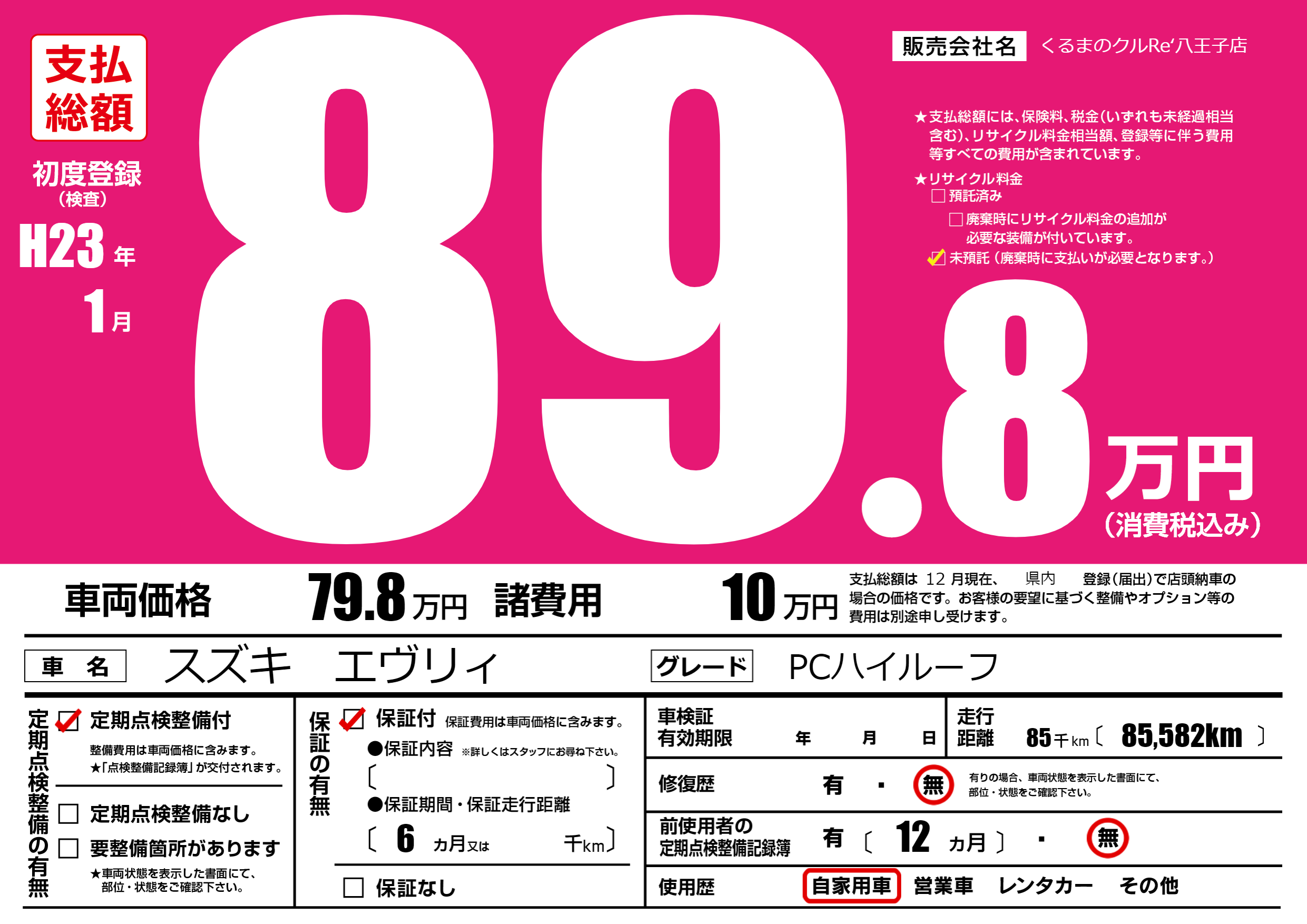 | 車名 | スズキ エヴリィ | グレード ミッション 排気量 |