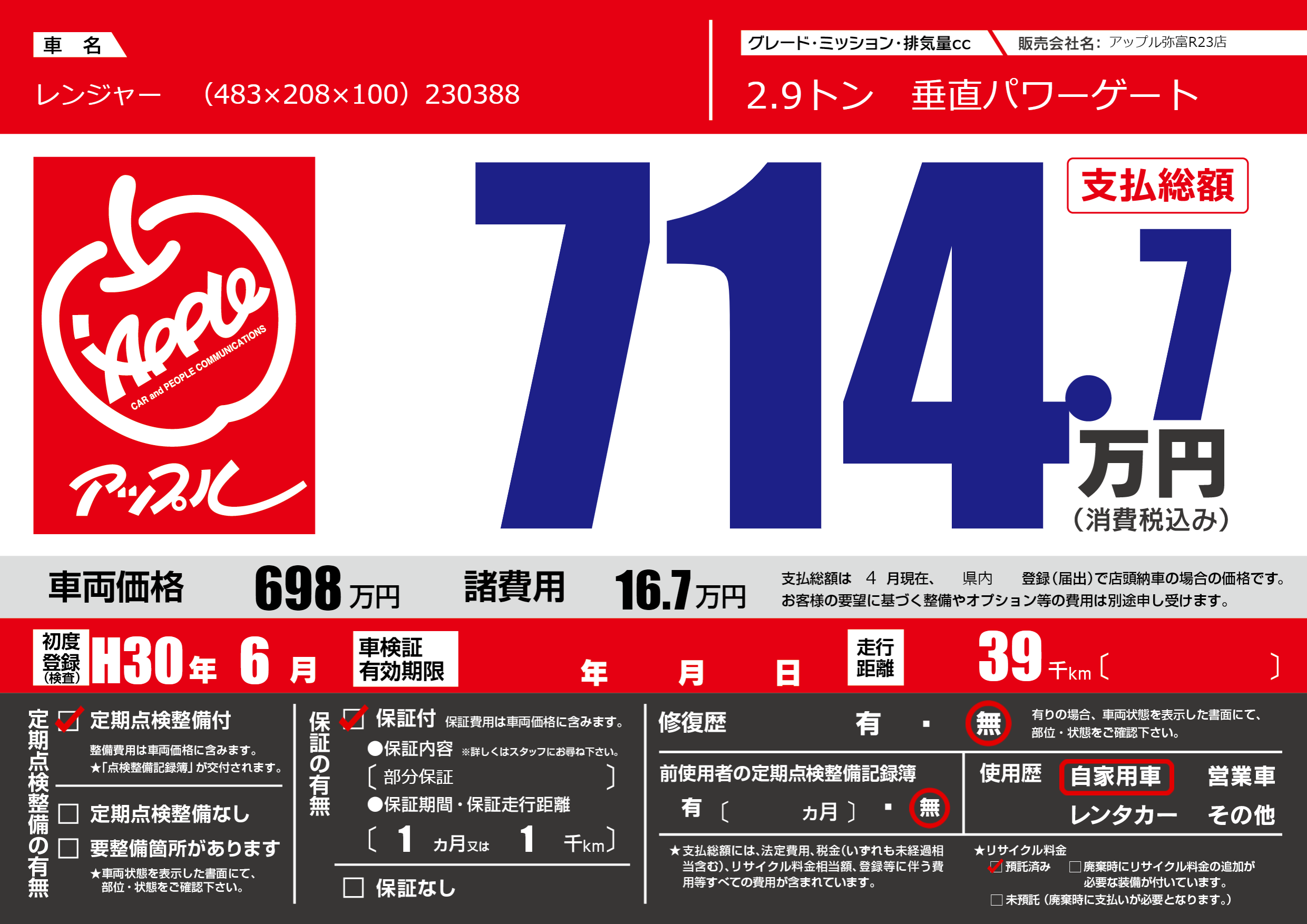 | 車名 | レンジャー (483×208×100)230388 | グレード ミッション 排気量 |