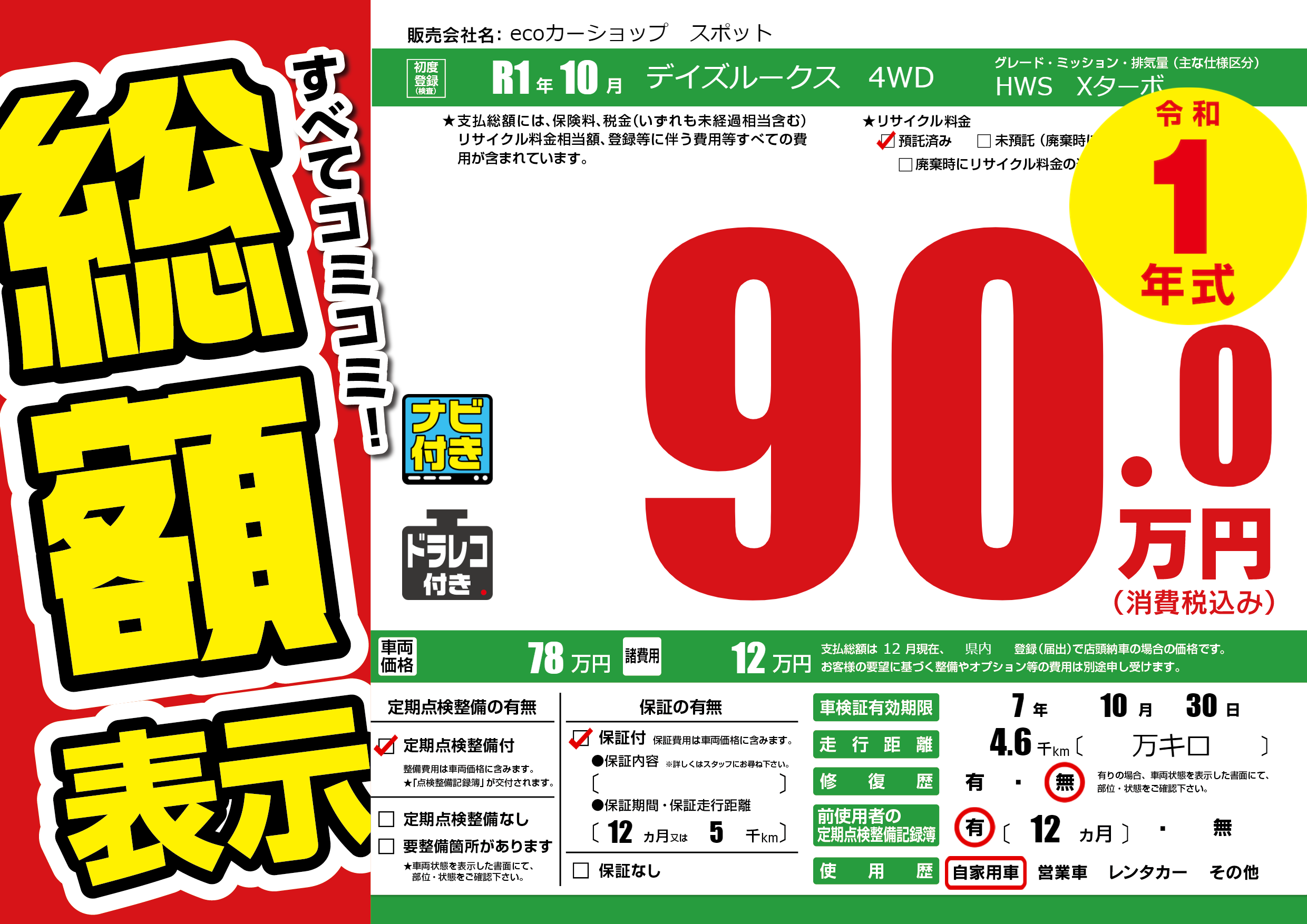 | 車名 | デイズルークス 4WD | グレード ミッション 排気量 |