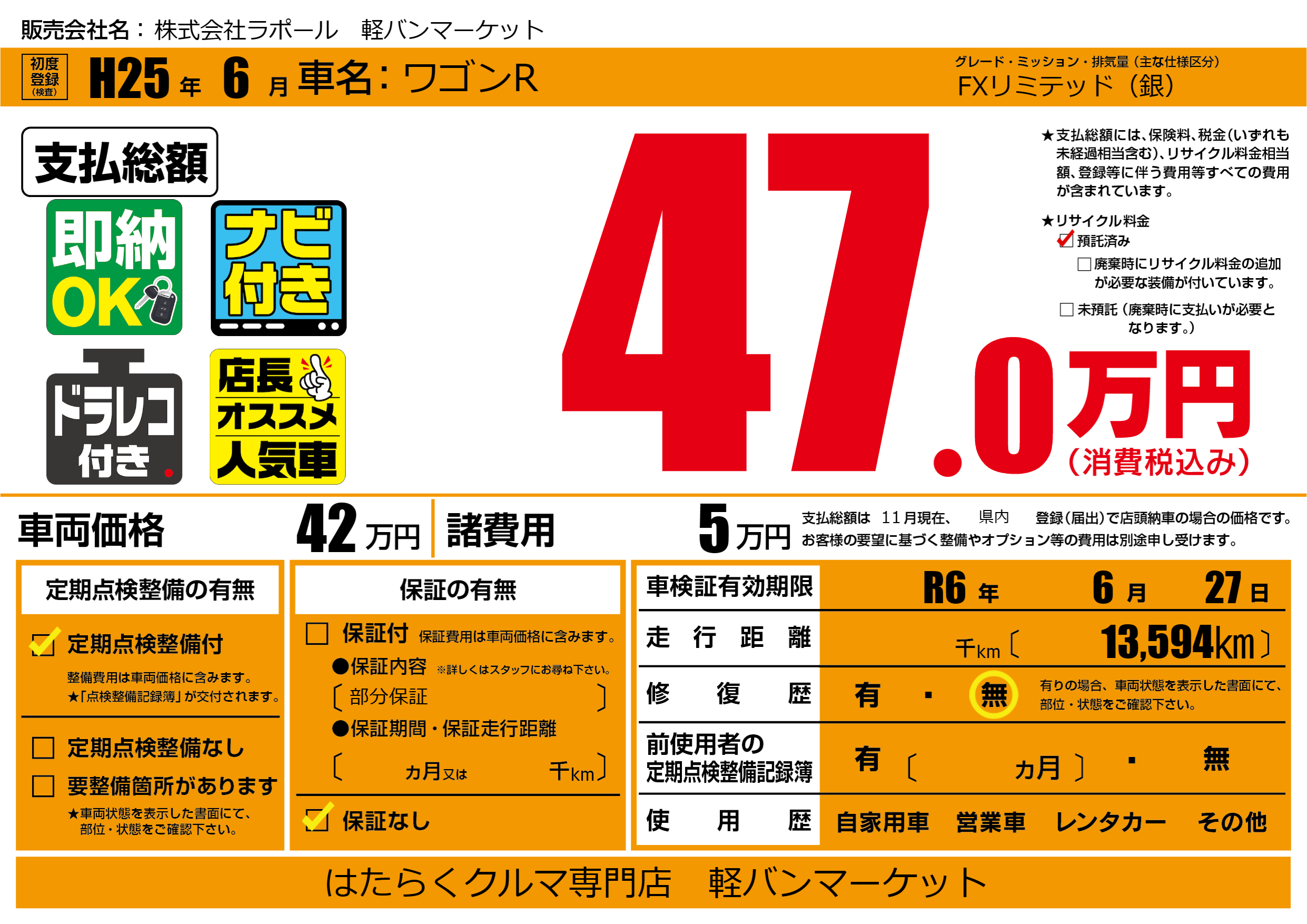 なし | 車検制限 | R6年6月27月 |