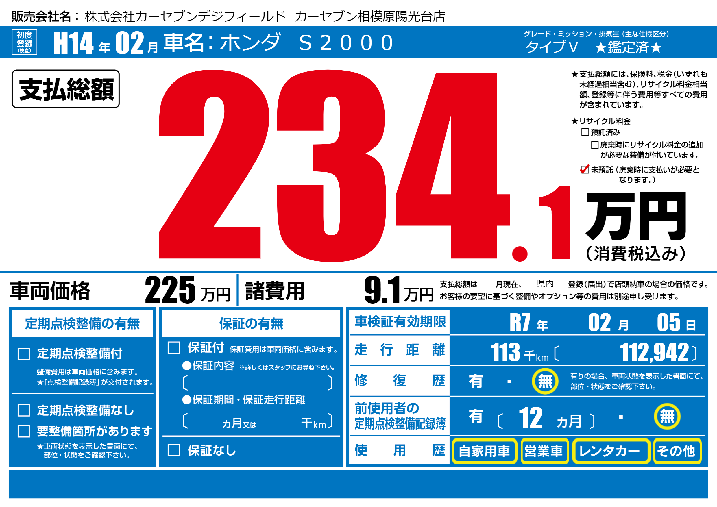 | 車検制限 | R7年 02月 05日 | ||