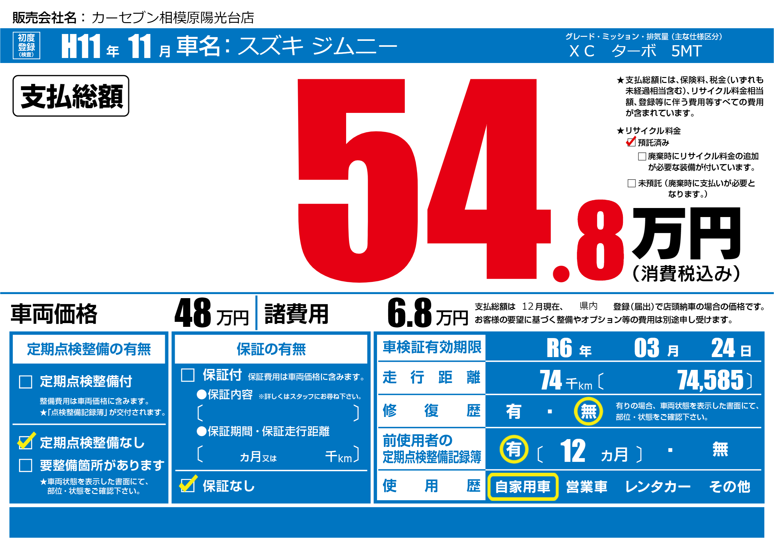 | 車名 | スズキ ジムニー | グレード ミッション 排気量 |