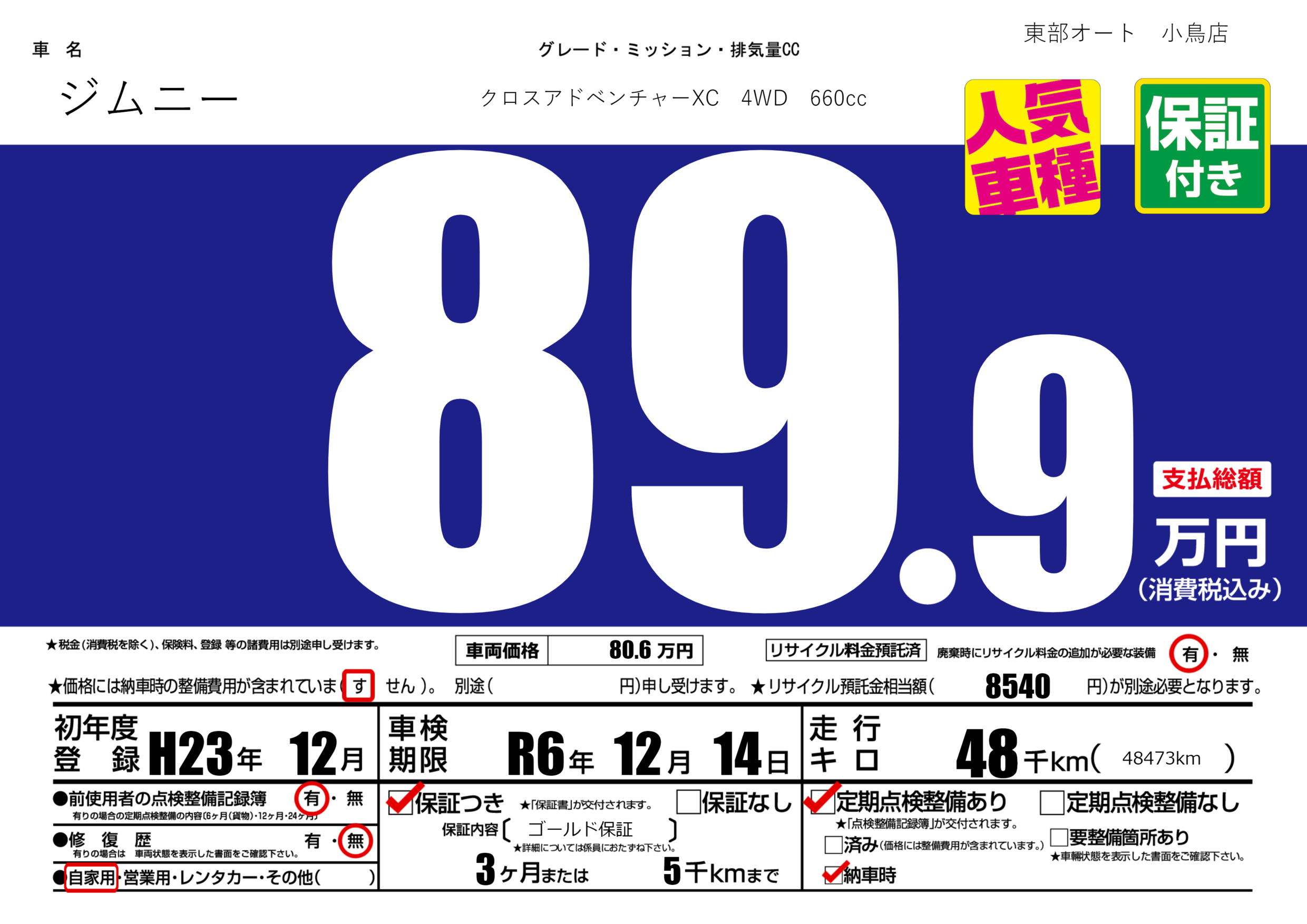 | 車名 | ジムニー | グレード ミッション 排気量 |