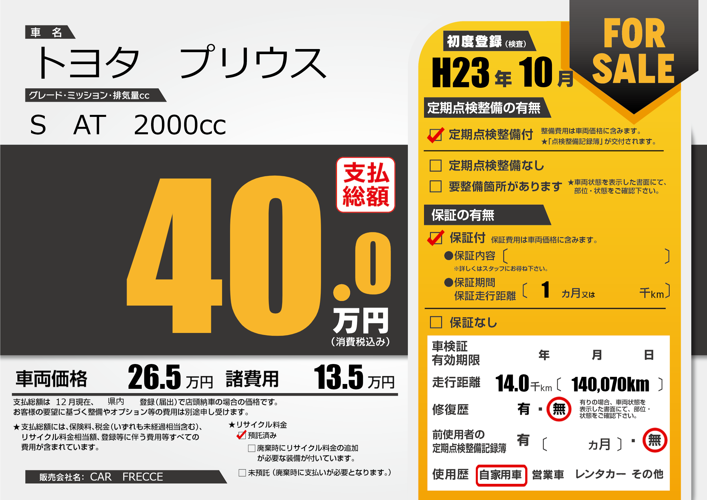 | 車名 | トヨタ プリウス | グレード ミッション 排気量 |